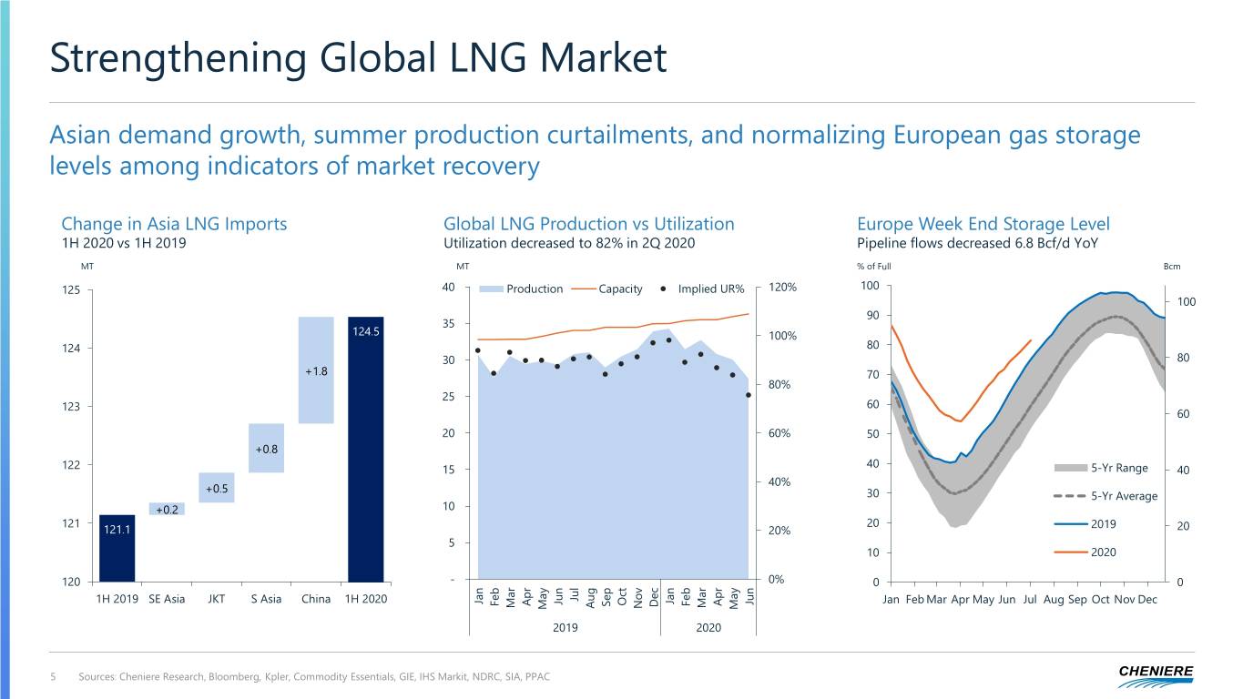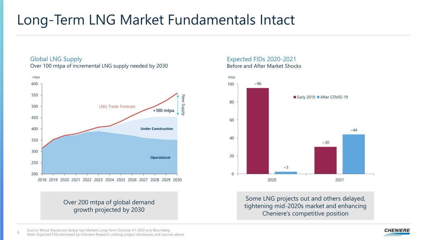 Strengthening Global LNG Market Asian demand growth, summer production curtailments, and normalizing European gas storage levels among indicators of market recovery Change in Asia LNG Imports Global LNG Production vs Utilization Europe Week End Storage Level 1H 2020 vs 1H 2019 Utilization decreased to 82% in 2Q 2020 Pipeline flows decreased 6.8 Bcf/d YoY MT MT % of Full Bcm 125 40 Production Capacity Implied UR% 120% 100 100 90 35 124.5 100% 124 80 30 80 +1.8 70 80% 25 123 60 60 20 60% 50 +0.8 40 122 15 5-Yr Range 40 40% +0.5 30 5-Yr Average +0.2 10 121 20 2019 121.1 20% 20 5 10 2020 120 - 0% 0 0 Jul Jan Jan Jun 1H 2019 SE Asia JKT S Asia China 1H 2020 Jun Jan Feb Mar Apr May Jun Jul Aug Sep Oct Nov Dec Oct Apr Apr Feb Feb Sep Dec Mar Mar Aug Nov May May 2019 2020 5 Sources: Cheniere Research, Bloomberg, Kpler, Commodity Essentials, GIE, IHS Markit, NDRC, SIA, PPAC