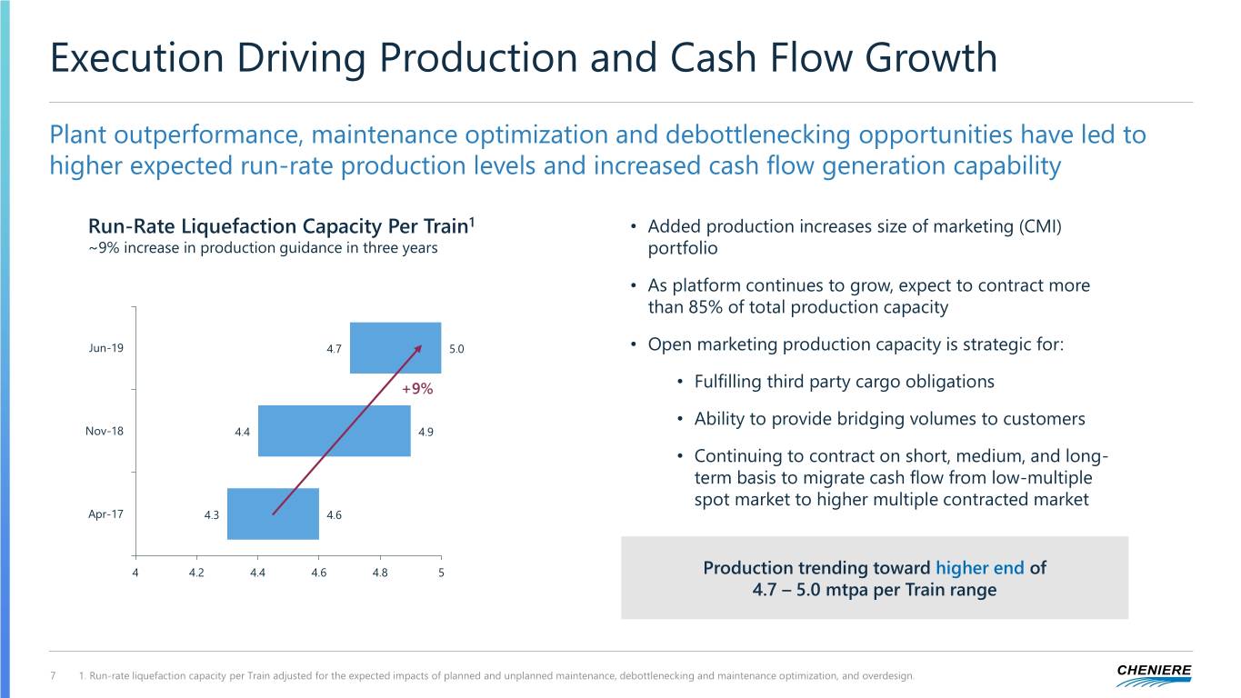 Long-Term LNG Market Fundamentals Intact Global LNG Supply Expected FIDs 2020-2021 Over 100 mtpa of incremental LNG supply needed by 2030 Before and After Market Shocks mtpa mtpa 600 100 ~96 550 Supply New Early 2019 After COVID-19 80 500 LNG Trade Forecast +100 mtpa 450 60 400 Under Construction ~44 40 350 ~30 300 Operational 20 250 ~3 200 0 2018 2019 2020 2021 2022 2023 2024 2025 2026 2027 2028 2029 2030 2020 2021 Some LNG projects out and others delayed, Over 200 mtpa of global demand tightening mid-2020s market and enhancing growth projected by 2030 Cheniere’s competitive position Source: Wood Mackenzie Global Gas Markets Long-Term Outlook H1 2020 and Bloomberg 6 Note: Expected FIDs estimated by Cheniere Research utilizing project disclosures and sources above
