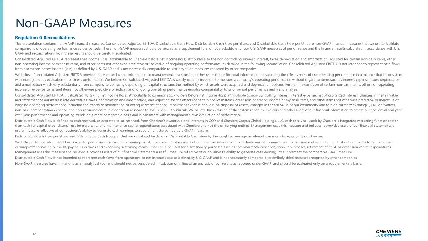 Non-GAAP Measures Regulation G Reconciliations This presentation contains non-GAAP financial measures. Consolidated Adjusted EBITDA, Distributable Cash Flow, Distributable Cash Flow per Share, and Distributable Cash Flow per Unit are non-GAAP financial measures that we use to facilitate comparisons of operating performance across periods. These non-GAAP measures should be viewed as a supplement to and not a substitute for our U.S. GAAP measures of performance and the financial results calculated in accordance with U.S. GAAP and reconciliations from these results should be carefully evaluated. Consolidated Adjusted EBITDA represents net income (loss) attributable to Cheniere before net income (loss) attributable to the non-controlling interest, interest, taxes, depreciation and amortization, adjusted for certain non-cash items, other non-operating income or expense items, and other items not otherwise predictive or indicative of ongoing operating performance, as detailed in the following reconciliation. Consolidated Adjusted EBITDA is not intended to represent cash flows from operations or net income (loss) as defined by U.S. GAAP and is not necessarily comparable to similarly titled measures reported by other companies. We believe Consolidated Adjusted EBITDA provides relevant and useful information to management, investors and other users of our financial information in evaluating the effectiveness of our operating performance in a manner that is consistent with management’s evaluation of business performance. We believe Consolidated Adjusted EBITDA is widely used by investors to measure a company’s operating performance without regard to items such as interest expense, taxes, depreciation and amortization which vary substantially from company to company depending on capital structure, the method by which assets were acquired and depreciation policies. Further, the exclusion of certain non-cash items, other non-operating income or expense items, and items not otherwise predictive or indicative of ongoing operating performance enables comparability to prior period performance and trend analysis. Consolidated Adjusted EBITDA is calculated by taking net income (loss) attributable to common stockholders before net income (loss) attributable to non-controlling interest, interest expense, net of capitalized interest, changes in the fair value and settlement of our interest rate derivatives, taxes, depreciation and amortization, and adjusting for the effects of certain non-cash items, other non-operating income or expense items, and other items not otherwise predictive or indicative of ongoing operating performance, including the effects of modification or extinguishment of debt, impairment expense and loss on disposal of assets, changes in the fair value of our commodity and foreign currency exchange (“FX”) derivatives, non-cash compensation expense, and non-recurring costs related to our response to the COVID-19 outbreak. We believe the exclusion of these items enables investors and other users of our financial information to assess our sequential and year- over-year performance and operating trends on a more comparable basis and is consistent with management’s own evaluation of performance. Distributable Cash Flow is defined as cash received, or expected to be received, from Cheniere’s ownership and interests in CQP and Cheniere Corpus Christi Holdings, LLC, cash received (used) by Cheniere’s integrated marketing function (other than cash for capital expenditures) less interest, taxes and maintenance capital expenditures associated with Cheniere and not the underlying entities. Management uses this measure and believes it provides users of our financial statements a useful measure reflective of our business’s ability to generate cash earnings to supplement the comparable GAAP measure. Distributable Cash Flow per Share and Distributable Cash Flow per Unit are calculated by dividing Distributable Cash Flow by the weighted average number of common shares or units outstanding. We believe Distributable Cash Flow is a useful performance measure for management, investors and other users of our financial information to evaluate our performance and to measure and estimate the ability of our assets to generate cash earnings after servicing our debt, paying cash taxes and expending sustaining capital, that could be used for discretionary purposes such as common stock dividends, stock repurchases, retirement of debt, or expansion capital expenditures. Management uses this measure and believes it provides users of our financial statements a useful measure reflective of our business’s ability to generate cash earnings to supplement the comparable GAAP measure. Distributable Cash Flow is not intended to represent cash flows from operations or net income (loss) as defined by U.S. GAAP and is not necessarily comparable to similarly titled measures reported by other companies. Non-GAAP measures have limitations as an analytical tool and should not be considered in isolation or in lieu of an analysis of our results as reported under GAAP, and should be evaluated only on a supplementary basis. 12