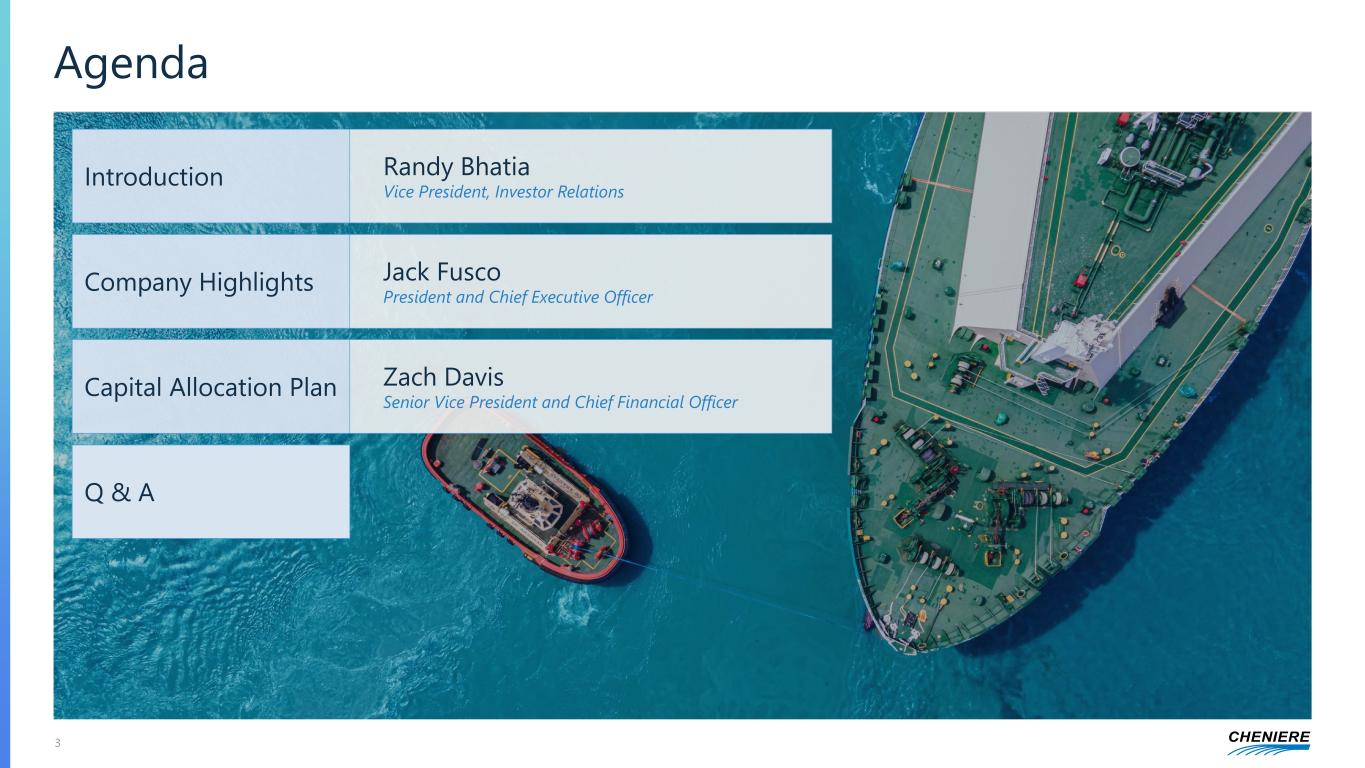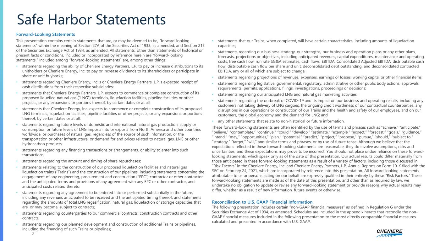 2 Forward-Looking Statements This presentation contains certain statements that are, or may be deemed to be, “forward-looking statements” within the meaning of Section 27A of the Securities Act of 1933, as amended, and Section 21E of the Securities Exchange Act of 1934, as amended. All statements, other than statements of historical or present facts or conditions, included or incorporated by reference herein are “forward-looking statements.” Included among “forward-looking statements” are, among other things: • statements regarding the ability of Cheniere Energy Partners, L.P. to pay or increase distributions to its unitholders or Cheniere Energy, Inc. to pay or increase dividends to its shareholders or participate in share or unit buybacks; • statements regarding Cheniere Energy, Inc.’s or Cheniere Energy Partners, L.P.’s expected receipt of cash distributions from their respective subsidiaries; • statements that Cheniere Energy Partners, L.P. expects to commence or complete construction of its proposed liquefied natural gas (“LNG”) terminals, liquefaction facilities, pipeline facilities or other projects, or any expansions or portions thereof, by certain dates or at all; • statements that Cheniere Energy, Inc. expects to commence or complete construction of its proposed LNG terminals, liquefaction facilities, pipeline facilities or other projects, or any expansions or portions thereof, by certain dates or at all; • statements regarding future levels of domestic and international natural gas production, supply or consumption or future levels of LNG imports into or exports from North America and other countries worldwide, or purchases of natural gas, regardless of the source of such information, or the transportation or other infrastructure, or demand for and prices related to natural gas, LNG or other hydrocarbon products; • statements regarding any financing transactions or arrangements, or ability to enter into such transactions; • statements regarding the amount and timing of share repurchases; • statements relating to the construction of our proposed liquefaction facilities and natural gas liquefaction trains (“Trains”) and the construction of our pipelines, including statements concerning the engagement of any engineering, procurement and construction ("EPC") contractor or other contractor and the anticipated terms and provisions of any agreement with any EPC or other contractor, and anticipated costs related thereto; • statements regarding any agreement to be entered into or performed substantially in the future, including any revenues anticipated to be received and the anticipated timing thereof, and statements regarding the amounts of total LNG regasification, natural gas, liquefaction or storage capacities that are, or may become, subject to contracts; • statements regarding counterparties to our commercial contracts, construction contracts and other contracts; • statements regarding our planned development and construction of additional Trains or pipelines, including the financing of such Trains or pipelines; • statements that our Trains, when completed, will have certain characteristics, including amounts of liquefaction capacities; • statements regarding our business strategy, our strengths, our business and operation plans or any other plans, forecasts, projections or objectives, including anticipated revenues, capital expenditures, maintenance and operating costs, free cash flow, run rate SG&A estimates, cash flows, EBITDA, Consolidated Adjusted EBITDA, distributable cash flow, distributable cash flow per share and unit, deconsolidated debt outstanding, and deconsolidated contracted EBITDA, any or all of which are subject to change; • statements regarding projections of revenues, expenses, earnings or losses, working capital or other financial items; • statements regarding legislative, governmental, regulatory, administrative or other public body actions, approvals, requirements, permits, applications, filings, investigations, proceedings or decisions; • statements regarding our anticipated LNG and natural gas marketing activities; • statements regarding the outbreak of COVID-19 and its impact on our business and operating results, including any customers not taking delivery of LNG cargoes, the ongoing credit worthiness of our contractual counterparties, any disruptions in our operations or construction of our Trains and the health and safety of our employees, and on our customers, the global economy and the demand for LNG; and • any other statements that relate to non-historical or future information. These forward-looking statements are often identified by the use of terms and phrases such as “achieve,” “anticipate,” “believe,” “contemplate,” “continue,” “could,” “develop,” “estimate,” “example,” “expect,” “forecast,” “goals,” ”guidance,” “intend,” “may,” “opportunities,” “plan,” “potential,” “predict,” “project,” “propose,” “pursue,” “should,” “subject to,” “strategy,” “target,” “will,” and similar terms and phrases, or by use of future tense. Although we believe that the expectations reflected in these forward-looking statements are reasonable, they do involve assumptions, risks and uncertainties, and these expectations may prove to be incorrect. You should not place undue reliance on these forward- looking statements, which speak only as of the date of this presentation. Our actual results could differ materially from those anticipated in these forward-looking statements as a result of a variety of factors, including those discussed in “Risk Factors” in the Cheniere Energy, Inc. and Cheniere Energy Partners, L.P. Annual Reports on Form 10-K filed with the SEC on February 24, 2021, which are incorporated by reference into this presentation. All forward-looking statements attributable to us or persons