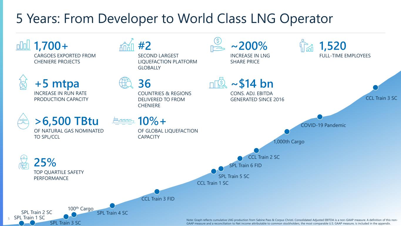 5 Years: From Developer to World Class LNG Operator COVID-19 Pandemic CCL Train 3 FID SPL Train 6 FID CCL Train 3 SC 1,000th Cargo #2 SECOND LARGEST LIQUEFACTION PLATFORM GLOBALLY 1,700+ CARGOES EXPORTED FROM CHENIERE PROJECTS 36 COUNTRIES & REGIONS DELIVERED TO FROM CHENIERE +5 mtpa INCREASE IN RUN RATE PRODUCTION CAPACITY ~$14 bn CONS. ADJ. EBITDA GENERATED SINCE 2016 ~200% INCREASE IN LNG SHARE PRICE SPL Train 1 SC SPL Train 2 SC 100th Cargo SPL Train 3 SC SPL Train 4 SC CCL Train 1 SC SPL Train 5 SC CCL Train 2 SC Note: Graph reflects cumulative LNG production from Sabine Pass & Corpus Christi. Consolidated Adjusted EBITDA is a non-GAAP measure. A definition of this non- GAAP measure and a reconciliation to Net income attributable to common stockholders, the most comparable U.S. GAAP measure, is included in the appendix. 25% TOP QUARTILE SAFETY PERFORMANCE 1,520 FULL-TIME EMPLOYEES >6,500 TBtu OF NATURAL GAS NOMINATED TO SPL/CCL 10%+ OF GLOBAL LIQUEFACTION CAPACITY 5