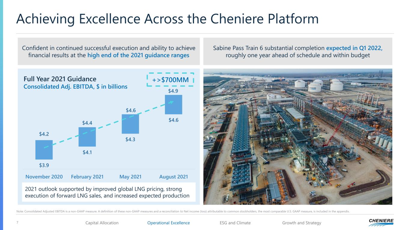 “All of the Above” Capital Allocation Strategy 6 Cheniere has reached its cash flow inflection point, enabling execution on balance sheet, capital return, and growth priorities Capital Allocation Operational Excellence ESG and Climate Growth and Strategy GUIDING PRINCIPLES Strengthen Balance Sheet Fund Financially Disciplined Growth Return Capital to Shareholders Create Shareholder Value through Financially Disciplined Organic Growth ▪ Plan to FID Corpus Christi Stage 3 in 2022 ▪ Further organic growth with commitment to disciplined investment parameters ▪ Develop environmental solutions opportunities along the LNG value chain Position Cheniere Capital Complex for Future Success ▪ Plan for ~$1 billion of annual debt repayment until investment grade credit metrics ▪ Target investment grade balance sheet by early-to-mid 2020s ▪ Long term sustainable balance sheet supports financial flexibility Sustainable Return of Shareholder Capital ▪ Initiating quarterly dividend at $0.33/share declared today ▪ Plan to grow dividend at mid-single digits, in line with S&P 500 average growth rate ▪ Share repurchases resumed in Q3. Reset $1 billion share buyback program in Q4 for 3 years