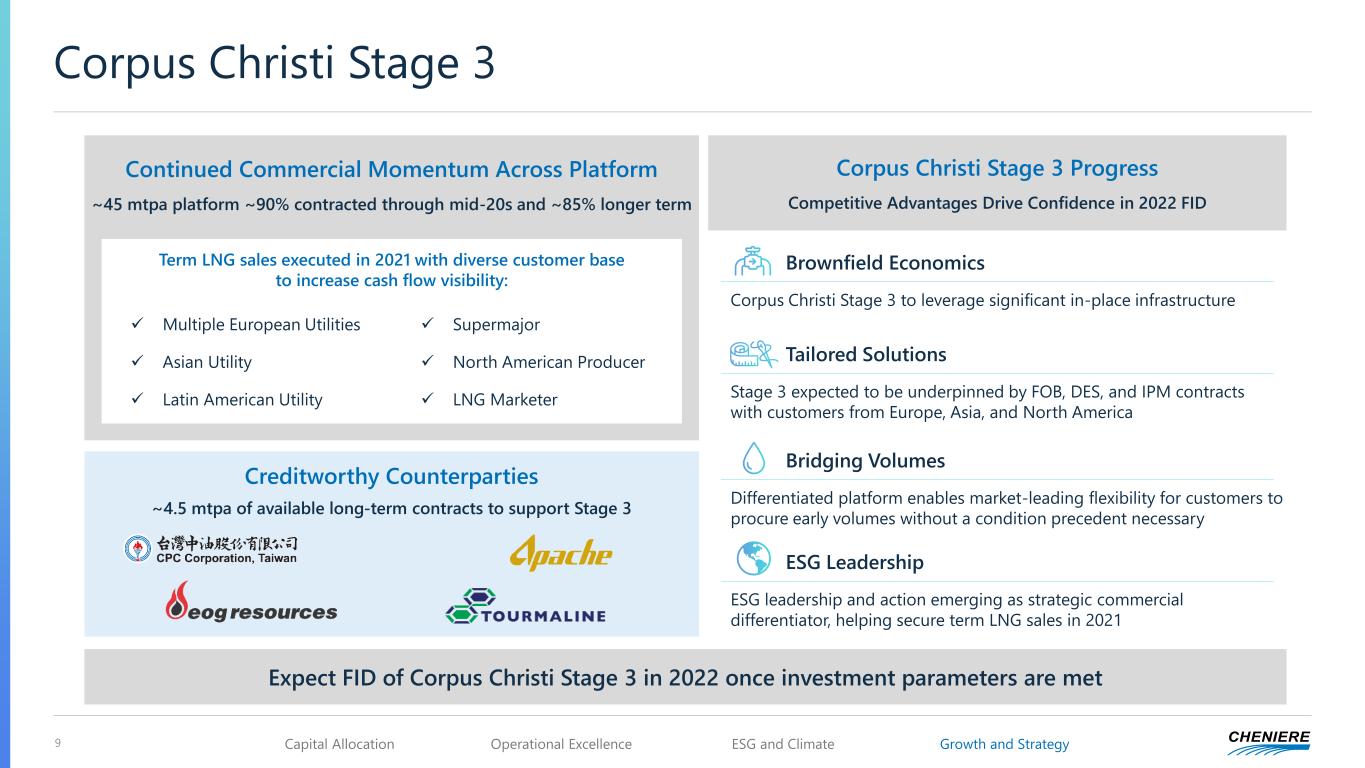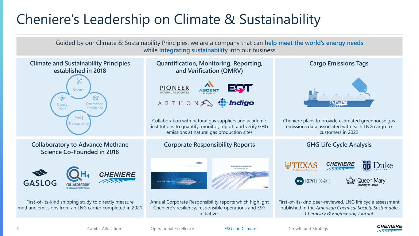 Cheniere’s Leadership on Climate & Sustainability 8 Climate and Sustainability Principles established in 2018 Collaboration with natural gas suppliers and academic institutions to quantify, monitor, report, and verify GHG emissions at natural gas production sites Cheniere plans to provide estimated greenhouse gas emissions data associated with each LNG cargo to customers in 2022 First-of-its-kind shipping study to directly measure methane emissions from an LNG carrier completed in 2021 Annual Corporate Responsibility reports which highlight Cheniere’s resiliency, responsible operations and ESG initiatives First-of-its-kind peer-reviewed, LNG life cycle assessment published in the American Chemical Society Sustainable Chemistry & Engineering Journal Guided by our Climate & Sustainability Principles, we are a company that can help meet the world’s energy needs while integrating sustainability into our business Quantification, Monitoring, Reporting, and Verification (QMRV) Cargo Emissions Tags GHG Life Cycle AnalysisCorporate Responsibility ReportsCollaboratory to Advance Methane Science Co-Founded in 2018 Science Operational Excellence Supply Chain Transparency Capital Allocation Operational Excellence ESG and Climate Growth and Strategy
