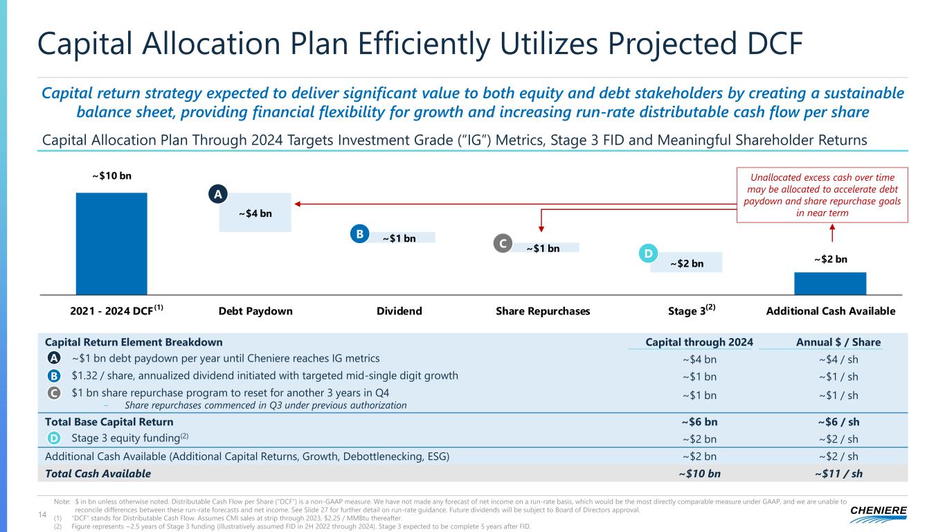 Note: Graphs do not include the impacts of FID of Corpus Christi Stage 3. Values above include forecasted figures. “DCF” stands for Distributable Cash Flow. Assumes CMI sales at strip through 2023, $2.25 / MMBtu thereafter. Consolidated Adjusted EBITDA and Distributable Cash Flow are non-GAAP measures. A definition of these non-GAAP measures and a reconciliation to Net income attributable to common stockholders, the most comparable U.S. GAAP measure, is included in the appendix. Future dividends will be subject to Board of Directors approval. Cheniere Has Reached Its Cash Flow Inflection Point 13 2016 2017 2018 2019 2020 2021 2022 2023 2024 Unprecedented Period of Investment Concludes ▪ To date, Cheniere has invested ~$30 billion of capital and <$500 million of spending remains ▪ Currently, 8 of 9 Trains operational with 9th Train expected Q1 2022 ▪ ~18 years average life remaining on contracts across portfolio Capital Expenditure Needs Have Been Greatly Reduced… … Accelerating Distributable Cash Flow and Opportunity for Capital Returns … And Also Commence Expected Steady Shareholder ReturnsCapital Allocation in Focus with ~$10 billion of Cumulative DCF through 2024 ▪ Achieving Investment Grade credit metrics in line-of-sight by completing ~$1 billion of debt paydown per year ▪ Ability to begin meaningful shareholder return through share repurchases and dividend C a p it a l E x p e n d it u re s D is tr ib u ta b le C a sh F lo w Cheniere Can Meet Public Commitment of Investment Grade Metrics… 2016 2017 2018 2019 2020 2021 2022 2023 2024 D e b t / E B IT D A 2016 2017 2018 2019 2020 2021 2022 2023 2024 D iv id e n d s P a id 2016 2017 2018 2019 2020 2021 2022 2023 2024