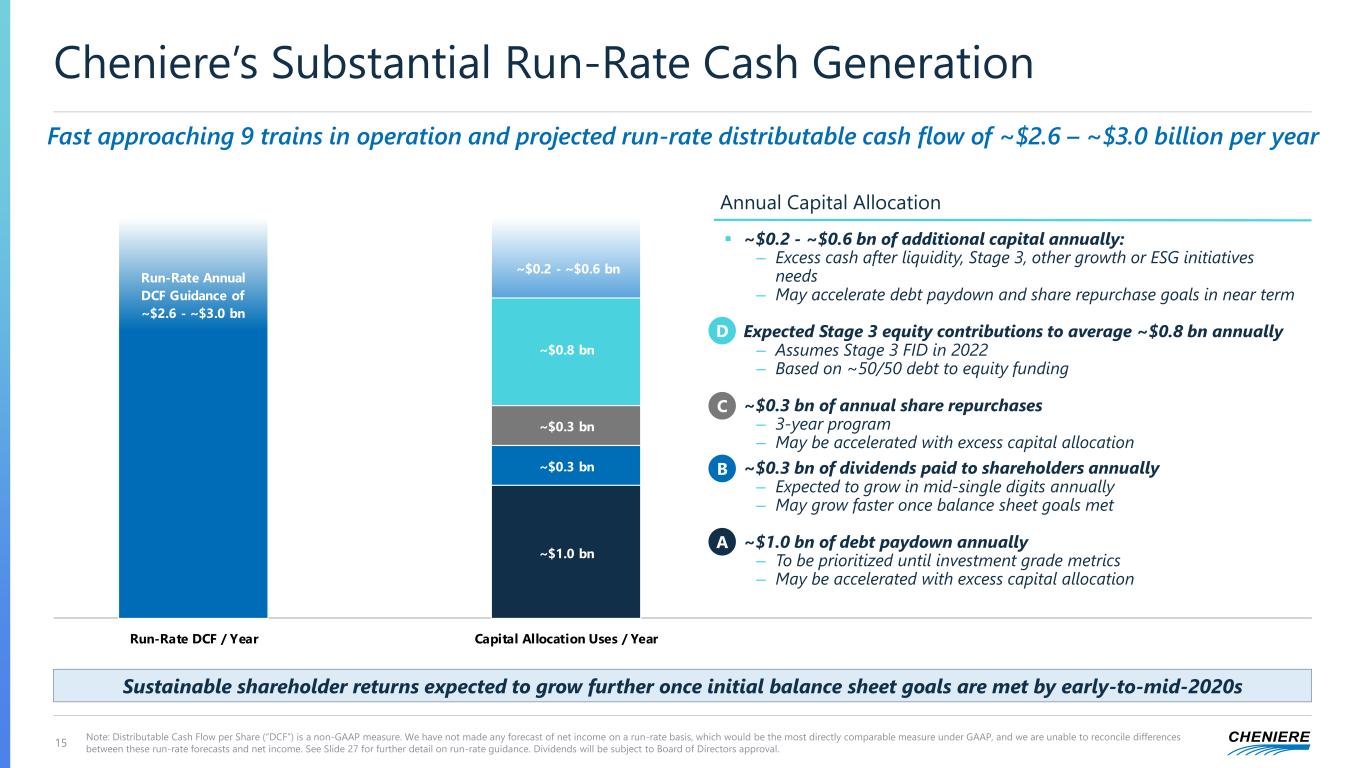 Note: $ in bn unless otherwise noted. Distributable Cash Flow per Share (“DCF”) is a non-GAAP measure. We have not made any forecast of net income on a run-rate basis, which would be the most directly comparable measure under GAAP, and we are unable to reconcile differences between these run-rate forecasts and net income. See Slide 27 for further detail on run-rate guidance. Future dividends will be subject to Board of Directors approval. (1) “DCF” stands for Distributable Cash Flow. Assumes CMI sales at strip through 2023, $2.25 / MMBtu thereafter. (2) Figure represents ~2.5 years of Stage 3 funding (illustratively assumed FID in 2H 2022 through 2024). Stage 3 expected to be complete 5 years after FID. Capital Allocation Plan Efficiently Utilizes Projected DCF 14 ~$10 bn ~$2 bn ~$4 bn ~$1 bn ~$1 bn ~$2 bn 2021 - 2024 DCF Debt Paydown Dividend Share Repurchases Stage 3 Additional Cash Available Capital return strategy expected to deliver significant value to both equity and debt stakeholders by creating a sustainable balance sheet, providing financial flexibility for growth and increasing run-rate distributable cash flow per share Capital Allocation Plan Through 2024 Targets Investment Grade (“IG”) Metrics, Stage 3 FID and Meaningful Shareholder Returns (1) (2) A B C D Unallocated excess cash over time may be allocated to accelerate debt paydown and share repurchase goals in near term Capital Return Element Breakdown Capital through 2024 Annual $ / Share ▪ ~$1 bn debt paydown per year until Cheniere reaches IG metrics ~$4 bn ~$4 / sh ▪ $1.32 / share, annualized dividend initiated with targeted mid-single digit growth ~$1 bn ~$1 / sh ▪ $1 bn share repurchase program to reset for another 3 years in Q4 − Share repurchases commenced in Q3 under previous authorization ~$1 bn ~$1 / sh Total Base Capital Return ~$6 bn ~$6 / sh ▪ Stage 3 equity funding(2) ~$2 bn ~$2 / sh Additional Cash Available (Additional Capital Returns, Growth, Debottlenecking, ESG) ~$2 bn ~$2 / sh Total Cash Available ~$10 bn ~$11 / sh B C D A