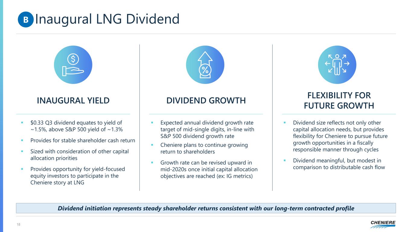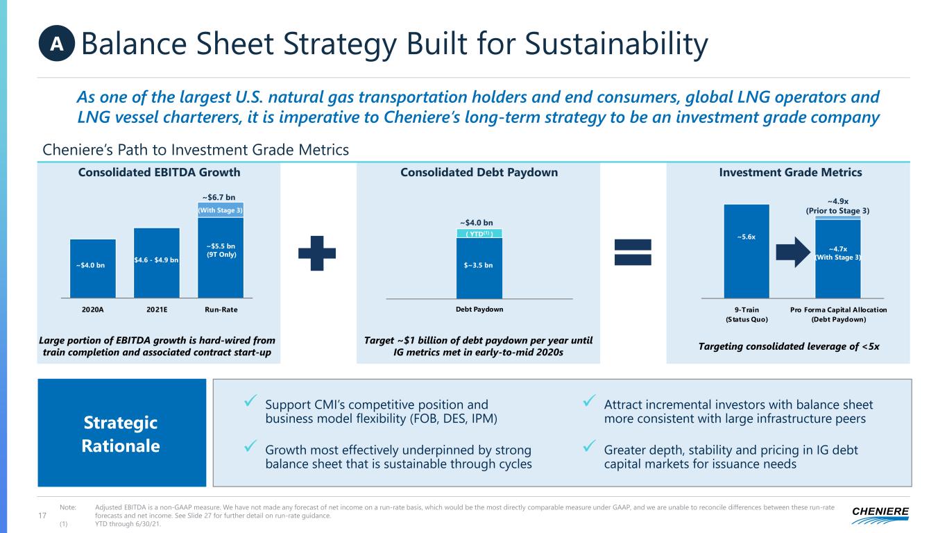 Capital Allocation Priorities 16 Meaningful Shareholder Returns ▪ Provide steady and meaningful capital returns to our shareholders in addition to growth and stronger balance sheet ▪ Initiate quarterly dividend in Q3 with plan to grow at mid-single digit growth rate through mid- 2020s, in line with S&P 500 average yield and growth rate – $0.33 Q3 dividend ($1.32 annualized) to be paid on November 17th, 2021 ▪ Reset share repurchase program to $1 billion for an additional 3 year authorization – Share repurchases commenced in Q3 under previous authorization; reset to $1 billion in Q4 – Structured to be opportunistic on share price dislocations and support run-rate DCF per share Projected ~$10 billion of cumulative DCF enables achievement of all capital allocation priorities to create long-term sustainable value A B C D Accretive Growth ▪ Corpus Christi Stage 3: ~10+ mtpa shovel-ready brownfield expansion project ▪ Committed to maintaining disciplined capital investment parameters consistent with CCL Train 3 and SPL Train 6 ▪ Approach funding of growth such that it also supports balance sheet goals ▪ Continued focus on ESG initiatives supporting long-term sustainability of assets Long-Term Sustainable Balance Sheet ▪ Prioritize targeting investment grade leverage metrics by early-to-mid-2020s (less than 5x consolidated debt-to-EBITDA) ▪ Maintain investment grade balance sheet to support financial flexibility for growth, commercial efforts, capital market access and steady shareholder return objectives