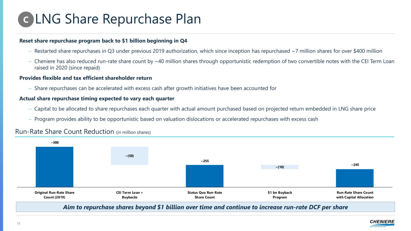 LNG Share Repurchase Plan 19 C Run-Rate Share Count Reduction (in million shares) Reset share repurchase program back to $1 billion beginning in Q4 – Restarted share repurchases in Q3 under previous 2019 authorization, which since inception has repurchased ~7 million shares for over $400 million – Cheniere has also reduced run-rate share count by ~40 million shares through opportunistic redemption of two convertible notes with the CEI Term Loan raised in 2020 (since repaid) Provides flexible and tax efficient shareholder return – Share repurchases can be accelerated with excess cash after growth initiatives have been accounted for Actual share repurchase timing expected to vary each quarter – Capital to be allocated to share repurchases each quarter with actual amount purchased based on projected return embedded in LNG share price – Program provides ability to be opportunistic based on valuation dislocations or accelerated repurchases with excess cash Aim to repurchase shares beyond $1 billion over time and continue to increase run-rate DCF per share ~300 ~255 ~245 ~(50) ~(10) Original Run-Rate Share Count (2019) CEI Term Loan + Buybacks Status Quo Run-Rate Share Count $1 bn Buyback Program Run-Rate Share Count with Capital Allocation