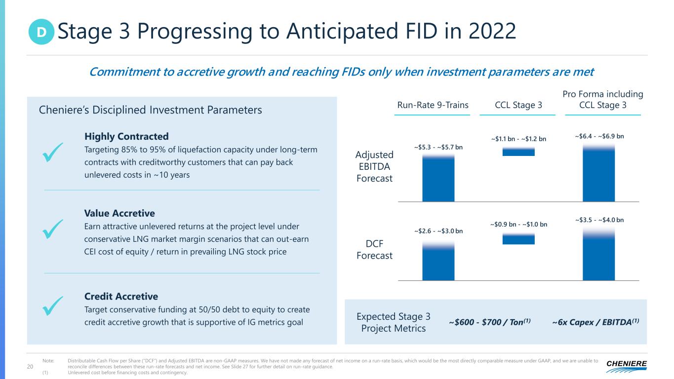 Note: Distributable Cash Flow per Share (“DCF”) and Adjusted EBITDA are non-GAAP measures. We have not made any forecast of net income on a run-rate basis, which would be the most directly comparable measure under GAAP, and we are unable to reconcile differences between these run-rate forecasts and net income. See Slide 27 for further detail on run-rate guidance. (1) Unlevered cost before financing costs and contingency. Stage 3 Progressing to Anticipated FID in 2022 20 D ~$2.6 - ~$3.0 bn ~$0.9 bn - ~$1.0 bn ~$3.5 - ~$4.0 bn ~$5.3 - ~$5.7 bn ~$1.1 bn - ~$1.2 bn ~$6.4 - ~$6.9 bn Commitment to accretive growth and reaching FIDs only when investment parameters are met Cheniere’s Disciplined Investment Parameters Highly Contracted Targeting 85% to 95% of liquefaction capacity under long-term contracts with creditworthy customers that can pay back unlevered costs in ~10 years Run-Rate 9-Trains Pro Forma including CCL Stage 3 Adjusted EBITDA Forecast DCF Forecast ~$600 - $700 / Ton(1) Value Accretive Earn attractive unlevered returns at the project level under conservative LNG market margin scenarios that can out-earn CEI cost of equity / return in prevailing LNG stock price Credit Accretive Target conservative funding at 50/50 debt to equity to create credit accretive growth that is supportive of IG metrics goal ~6x Capex / EBITDA(1) Expected Stage 3 Project Metrics ✓ ✓ ✓ CCL Stage 3