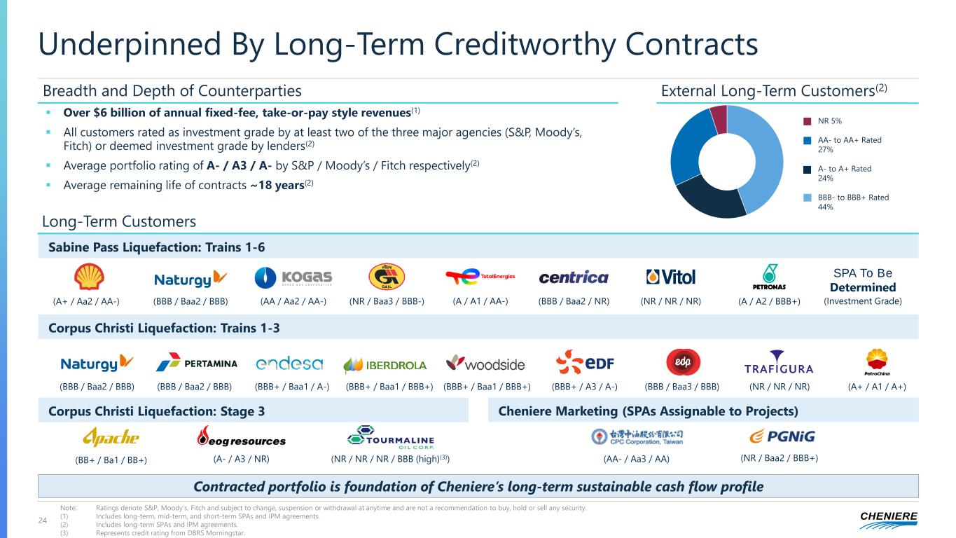 Note: Ratings denote S&P, Moody’s, Fitch and subject to change, suspension or withdrawal at anytime and are not a recommendation to buy, hold or sell any security. (1) Includes long-term, mid-term, and short-term SPAs and IPM agreements. (2) Includes long-term SPAs and IPM agreements. (3) Represents credit rating from DBRS Morningstar. Underpinned By Long-Term Creditworthy Contracts 24 (A+ / Aa2 / AA-) (AA / Aa2 / AA-) (NR / Baa3 / BBB-) (A / A1 / AA-) (BBB / Baa2 / NR) (BBB / Baa2 / BBB) (BBB+ / Baa1 / A-) (BBB+ / Baa1 / BBB+) (BBB+ / Baa1 / BBB+) (BBB+ / A3 / A-) (BBB / Baa3 / BBB) (NR / NR / NR) (A+ / A1 / A+)(BBB / Baa2 / BBB) (NR / NR / NR) (Investment Grade) SPA To Be Determined ▪ Over $6 billion of annual fixed-fee, take-or-pay style revenues(1) ▪ All customers rated as investment grade by at least two of the three major agencies (S&P, Moody’s, Fitch) or deemed investment grade by lenders(2) ▪ Average portfolio rating of A- / A3 / A- by S&P / Moody’s / Fitch respectively(2) ▪ Average remaining life of contracts ~18 years(2) (AA- / Aa3 / AA) (NR / Baa2 / BBB+) (BBB / Baa2 / BBB) (BB+ / Ba1 / BB+) Contracted portfolio is foundation of Cheniere’s long-term sustainable cash flow profile (A- / A3 / NR) Sabine Pass Liquefaction: Trains 1-6 Corpus Christi Liquefaction: Trains 1-3 Corpus Christi Liquefaction: Stage 3 Cheniere Marketing (SPAs Assignable to Projects) NR 5% AA- to AA+ Rated 27% A- to A+ Rated 24% BBB- to BBB+ Rated 44% (A / A2 / BBB+) Breadth and Depth of Counterparties External Long-Term Customers(2) Long-Term Customers (NR / NR / NR / BBB (high)(3))