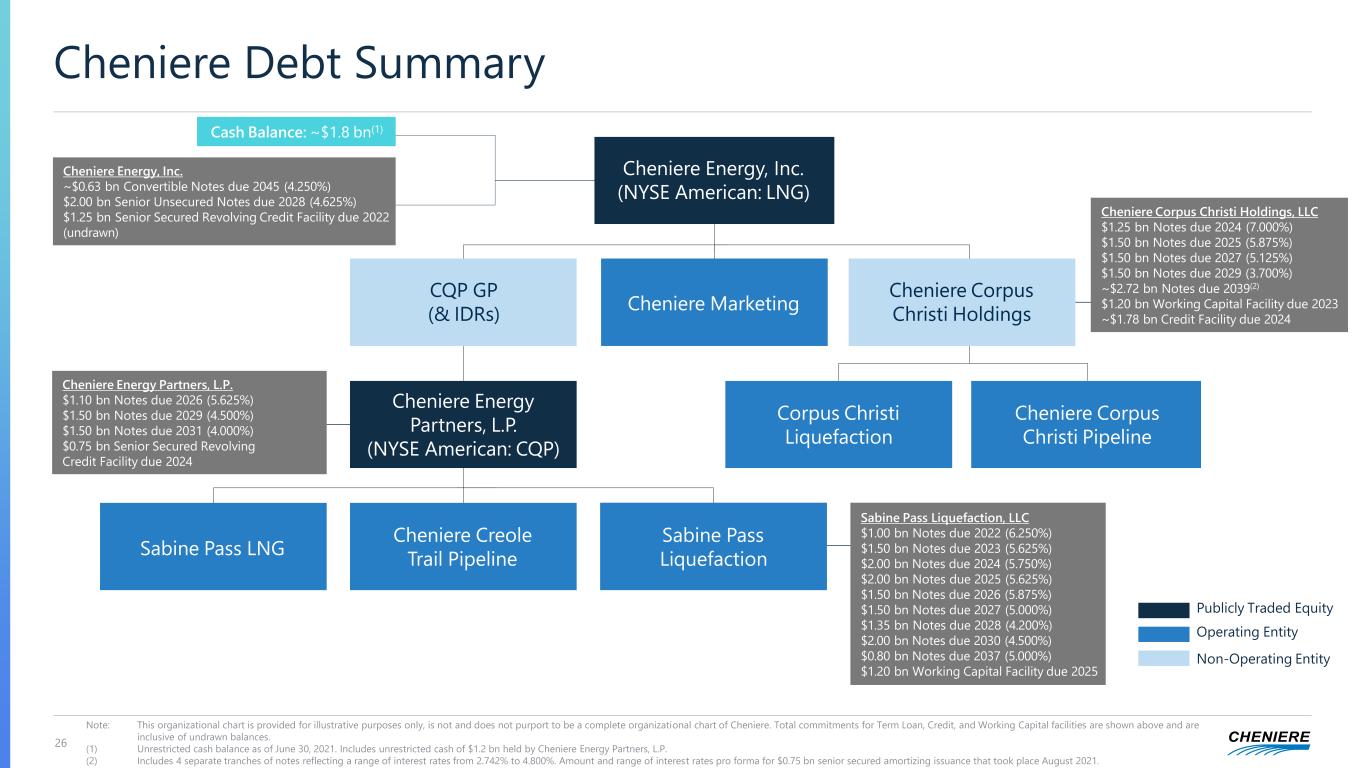Balance Sheet Strategy Accelerates Ratings Progress 25 Focus on simple consolidated credit metrics for corporate entities CEI and CQP – Target less than 5x consolidated debt-to-EBITDA by early-to-mid-2020s to achieve investment grade credit metrics Pay down ~$4 billion of consolidated debt through 2024 to reach targeted <5x consolidated debt-to-EBITDA – Target ~$1 billion per year to prioritize repayment of callable or maturing secured project debt at SPL and CCH to bolster project ratings and lessen subordination of the CEI-level and CQP-level credit profiles – Excess cash flow can accelerate debt paydown program to over $1 billion per year Migrate portion of project level debt to corporate levels to de-lever projects and reduce total secured debt – CEI and CQP issuances to be callable in near-term in anticipation of consolidated investment grade ratings in coming years Proactively manage maturity profile with long-term refinancings to increase financial flexibility and reduce capital markets risk – Continue to incorporate long-term amortizing issuances through late 2030s in addition to long-term bullet bonds to better match contract and liability life and receive favorable ratings agency treatment Ratings Evolution ✓With both projects rated IG, there is upward ratings momentum at both CQP and CEI ✓S&P revised CEI, CQP and SPL outlook to positive and Fitch revised CQP outlook to positive from stable Year 2015A 2016A 2017A 2018A 2019A 2020A 2021E (Current) BB+ / Ba3 / NR BBB- / Ba2 / NR BBB- / Ba1 / BBB- BBB- / Baa3 / BBB- B+ / NR / NR BB- / NR / NR BB / NR / NR BB / Ba3 / NRBB- / Ba3/ NR BB / Ba2/ NR BBB- / Ba1/ BBB- BBB- / Baa3/ BBB- BB / Ba2 / BB BB / Ba2 / BB SPL CCH CQP CEI