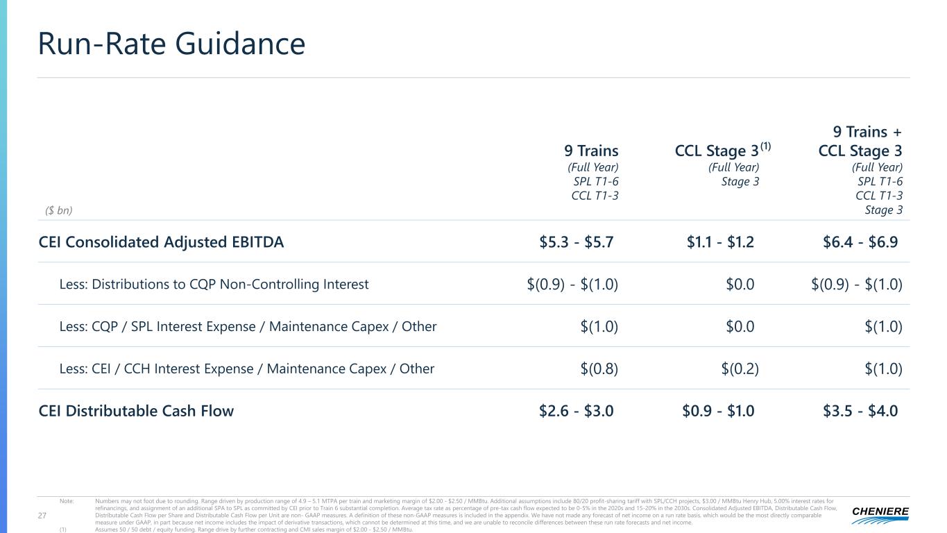 Note: This organizational chart is provided for illustrative purposes only, is not and does not purport to be a complete organizational chart of Cheniere. Total commitments for Term Loan, Credit, and Working Capital facilities are shown above and are inclusive of undrawn balances. (1) Unrestricted cash balance as of June 30, 2021. Includes unrestricted cash of $1.2 bn held by Cheniere Energy Partners, L.P. (2) Includes 4 separate tranches of notes reflecting a range of interest rates from 2.742% to 4.800%. Amount and range of interest rates pro forma for $0.75 bn senior secured amortizing issuance that took place August 2021. Cheniere Debt Summary 26 Publicly Traded Equity Operating Entity Non-Operating Entity Cheniere Energy, Inc. (NYSE American: LNG) Cheniere Energy Partners, L.P. (NYSE American: CQP) Sabine Pass LNG Sabine Pass Liquefaction Cheniere Creole Trail Pipeline Cheniere Corpus Christi Holdings Corpus Christi Liquefaction CQP GP (& IDRs) Cheniere Marketing Cheniere Corpus Christi Pipeline Cheniere Energy, Inc. ~$0.63 bn Convertible Notes due 2045 (4.250%) $2.00 bn Senior Unsecured Notes due 2028 (4.625%) $1.25 bn Senior Secured Revolving Credit Facility due 2022 (undrawn) Cheniere Corpus Christi Holdings, LLC $1.25 bn Notes due 2024 (7.000%) $1.50 bn Notes due 2025 (5.875%) $1.50 bn Notes due 2027 (5.125%) $1.50 bn Notes due 2029 (3.700%) ~$2.72 bn Notes due 2039(2) $1.20 bn Working Capital Facility due 2023 ~$1.78 bn Credit Facility due 2024 Sabine Pass Liquefaction, LLC $1.00 bn Notes due 2022 (6.250%) $1.50 bn Notes due 2023 (5.625%) $2.00 bn Notes due 2024 (5.750%) $2.00 bn Notes due 2025 (5.625%) $1.50 bn Notes due 2026 (5.875%) $1.50 bn Notes due 2027 (5.000%) $1.35 bn Notes due 2028 (4.200%) $2.00 bn Notes due 2030 (4.500%) $0.80 bn Notes due 2037 (5.000%) $1.20 bn Working Capital Facility due 2025 Cheniere Energy Partners, L.P. $1.10 bn Notes due 2026 (5.625%) $1.50 bn Notes due 2029 (4.500%) $1.50 bn Notes due 2031 (4.000%) $0.75 bn Senior Secured Revolving Credit Facility due 2024 Cash Balance: ~$1.8 bn(1)