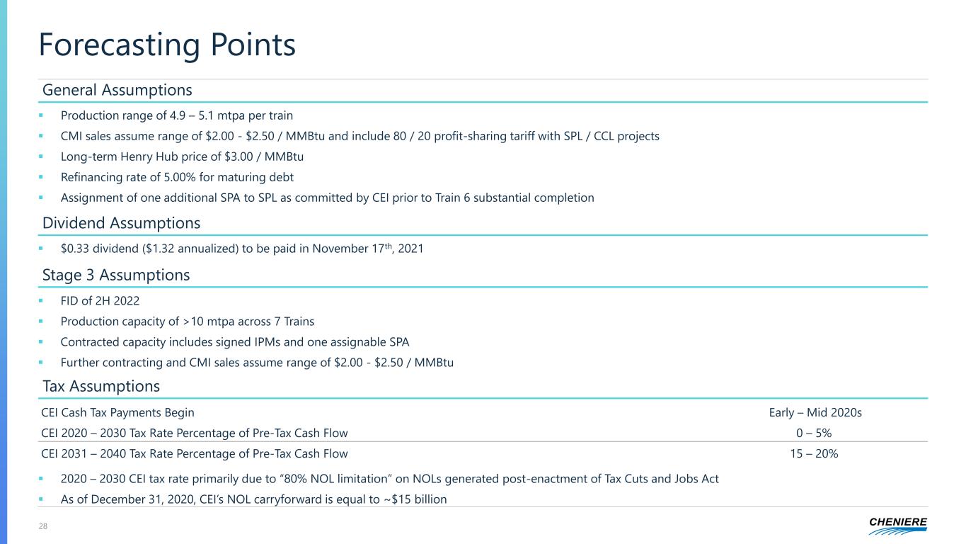 Note: Numbers may not foot due to rounding. Range driven by production range of 4.9 – 5.1 MTPA per train and marketing margin of $2.00 - $2.50 / MMBtu. Additional assumptions include 80/20 profit-sharing tariff with SPL/CCH projects, $3.00 / MMBtu Henry Hub, 5.00% interest rates for refinancings, and assignment of an additional SPA to SPL as committed by CEI prior to Train 6 substantial completion. Average tax rate as percentage of pre-tax cash flow expected to be 0-5% in the 2020s and 15-20% in the 2030s. Consolidated Adjusted EBITDA, Distributable Cash Flow, Distributable Cash Flow per Share and Distributable Cash Flow per Unit are non- GAAP measures. A definition of these non-GAAP measures is included in the appendix. We have not made any forecast of net income on a run rate basis, which would be the most directly comparable measure under GAAP, in part because net income includes the impact of derivative transactions, which cannot be determined at this time, and we are unable to reconcile differences between these run rate forecasts and net income. (1) Assumes 50 / 50 debt / equity funding. Range drive by further contracting and CMI sales margin of $2.00 - $2.50 / MMBtu. Run-Rate Guidance 27 ($ bn) 9 Trains (Full Year) SPL T1-6 CCL T1-3 CCL Stage 3 (Full Year) Stage 3 9 Trains + CCL Stage 3 (Full Year) SPL T1-6 CCL T1-3 Stage 3 CEI Consolidated Adjusted EBITDA $5.3 - $5.7) $1.1 - $1.2) $6.4 - $6.9) Less: Distributions to CQP Non-Controlling Interest $(0.9) - $(1.0) $0.0) $(0.9) - $(1.0) Less: CQP / SPL Interest Expense / Maintenance Capex / Other $(1.0) $0.0) $(1.0) Less: CEI / CCH Interest Expense / Maintenance Capex / Other $(0.8) $(0.2) $(1.0) CEI Distributable Cash Flow $2.6 - $3.0) $0.9 - $1.0) $3.5 - $4.0) (1)