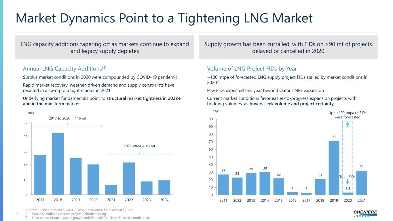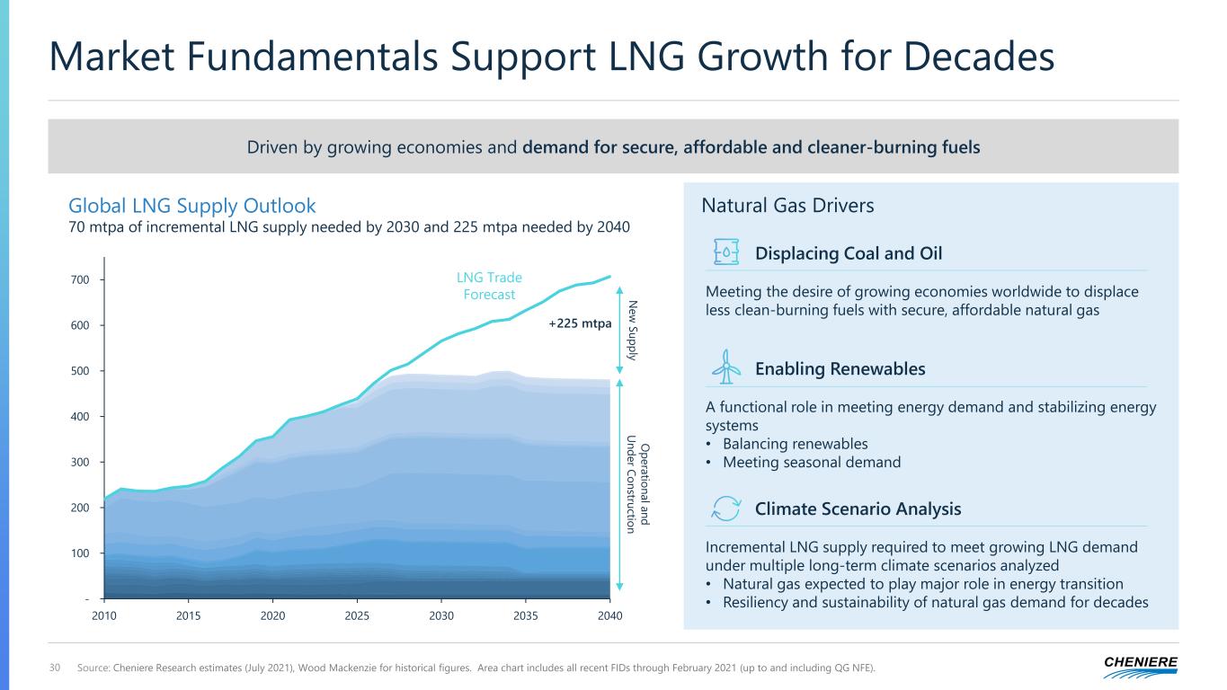 Sources: Cheniere Research, GIIGNL, Wood Mackenzie for historical figures. (1) Capacity additions include project debottlenecking. (2) Next period of rapid supply growth (mid/late 2020’s) likely deferred / moderated. Market Dynamics Point to a Tightening LNG Market 29 LNG capacity additions tapering off as markets continue to expand and legacy supply depletes Annual LNG Capacity Additions(1) Surplus market conditions in 2020 were compounded by COVID-19 pandemic Rapid market recovery, weather-driven demand and supply constraints have resulted in a swing to a tight market in 2021 Underlying market fundamentals point to structural market tightness in 2022+ and in the mid-term market Volume of LNG Project FIDs by Year ~100 mtpa of forecasted LNG supply project FIDs stalled by market conditions in 2020(2) Few FIDs expected this year beyond Qatar’s NFE expansion Current market conditions favor easier-to-progress expansion projects with bridging volumes, as buyers seek volume and project certainty 0 10 20 30 40 50 2017 2018 2019 2020 2021 2022 2023 2024 2017 to 2020 = 116 mt 2021-2024 = 48 mt mtpa Supply growth has been curtailed, with FIDs on >90 mt of projects delayed or cancelled in 2020 mtpa 27 23 29 30 22 4 3 21 71 3.3 32 0 10 20 30 40 50 60 70 80 90 100 2011 2012 2013 2014 2015 2016 2017 2018 2019 2020 2021 Up to 100 mtpa of FIDs were forecasted Total FIDs