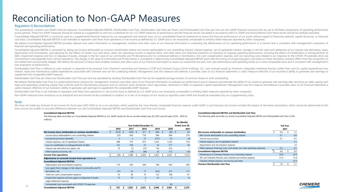 Regulation G Reconciliations This presentation contains non-GAAP financial measures. Consolidated Adjusted EBITDA, Distributable Cash Flow, Distributable Cash Flow per Share, and Distributable Cash Flow per Unit are non-GAAP financial measures that we use to facilitate comparisons of operating performance across periods. These non-GAAP measures should be viewed as a supplement to and not a substitute for our U.S. GAAP measures of performance and the financial results calculated in accordance with U.S. GAAP and reconciliations from these results should be carefully evaluated. Consolidated Adjusted EBITDA is commonly used as a supplemental financial measure by our management and external users of our consolidated financial statements to assess the financial performance of our assets without regard to financing methods, capital structures, or historical cost basis. Consolidated Adjusted EBITDA is not intended to represent cash flows from operations or net income as defined by U.S. GAAP and is not necessarily comparable to similarly titled measures reported by other companies. We believe Consolidated Adjusted EBITDA provides relevant and useful information to management, investors and other users of our financial information in evaluating the effectiveness of our operating performance in a manner that is consistent with management’s evaluation of financial and operating performance. Consolidated Adjusted EBITDA is calculated by taking net income attributable to common stockholders before net income attributable to non-controlling interest, interest expense, net of capitalized interest, changes in the fair value and settlement of our interest rate derivatives, taxes, depreciation and amortization, and adjusting for the effects of certain non-cash items, other non-operating income or expense items, and other items not otherwise predictive or indicative of ongoing operating performance, including the effects of modification or extinguishment of debt, impairment expense and loss on disposal of assets, changes in the fair value of our commodity and FX derivatives prior to contractual delivery or termination, non-cash compensation expense, and non-recurring costs related to our response to the COVID-19 outbreak which are incremental to and separable from normal operations. The change in fair value of commodity and FX derivatives is considered in determining Consolidated Adjusted EBITDA given that the timing of recognizing gains and losses on these derivative contracts differs from the recognition of the related item economically hedged. We believe the exclusion of these items enables investors and other users of our financial information to assess our sequential and year-over-year performance and operating trends on a more comparable basis and is consistent with management’s own evaluation of performance. Distributable Cash Flow is defined as cash received, or expected to be received, from Cheniere’s ownership and interests in CQP and Cheniere Corpus Christi Holdings, LLC, cash received (used) by Cheniere’s integrated marketing function (other than cash for capital expenditures) less interest, taxes and maintenance capital expenditures associated with Cheniere and not the underlying entities. Management uses this measure and believes it provides users of our financial statements a useful measure reflective of our business’s ability to generate cash earnings to supplement the comparable GAAP measure. Distributable Cash Flow per Share and Distributable Cash Flow per Unit are calculated by dividing Distributable Cash Flow by the weighted average number of common shares or units outstanding. We believe Distributable Cash Flow is a useful performance measure for management, investors and other users of our financial information to evaluate our performance and to measure and estimate the ability of our assets to generate cash earnings after servicing our debt, paying cash taxes and expending sustaining capital, that could be used for discretionary purposes such as common stock dividends, stock repurchases, retirement of debt, or expansion capital expenditures. Management uses this measure and believes it provides users of our financial statements a useful measure reflective of our business’s ability to generate cash earnings to supplement the comparable GAAP measure. Distributable Cash Flow is not intended to represent cash flows from operations or net income (loss) as defined by U.S. GAAP and is not necessarily comparable to similarly titled measures reported by other companies. Non-GAAP measures have limitations as an analytical tool and should not be considered in isolation or in lieu of an analysis of our results as reported under GAAP and should be evaluated only on a supplementary basis. Note: We have not made any forecast of net income for fiscal years 2022-2024 or on a run rate basis, which would be the most directly comparable financial measure under GAAP, in part because net income includes the impact of derivative transactions, which cannot be determined at this time, and we are unable to reconcile differences between run rate Consolidated Adjusted EBITDA and Distributable Cash Flow and income. Reconciliation to Non-GAAP Measures 31 Consolidated Adjusted EBITDA Six Months Ended June 30, 2016 2017 2018 2019 2020 2021 Net income (loss) attributable to common stockholders (610)$ (393)$ 471$ 648$ (85)$ 64$ Income (loss) attributable to non-controlling interest (55) 956 729 584 586 376 Income tax provision (benefit) 2 3 27 (517) 43 (4) Interest expense, net of capitalized interest 488 747 875 1,432 1,525 724 Loss on modification or extinguishment of debt 135 100 27 55 217 59 Interest rate derivative loss (gain), net 10 (7) (57) 134 233 1 Other expense (income), net - (18) (48) 25 112 (10) Income from operations (30)$ 1,388$ 2,024$ 2,361$ 2,631$ 1,210$ Adjustments to reconcile income from operations to Consolidated Adjusted EBITDA Depreciation and amortization expense 174 356 449 794 93