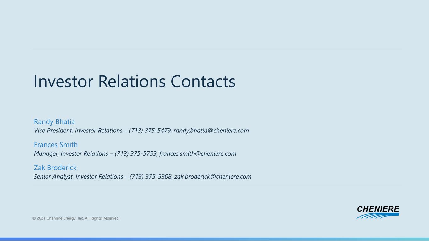 © 2021 Cheniere Energy, Inc. All Rights Reserved Investor Relations Contacts Randy Bhatia Vice President, Investor Relations – (713) 375-5479, randy.bhatia@cheniere.com Frances Smith Manager, Investor Relations – (713) 375-5753, frances.smith@cheniere.com Zak Broderick Senior Analyst, Investor Relations – (713) 375-5308, zak.broderick@cheniere.com
