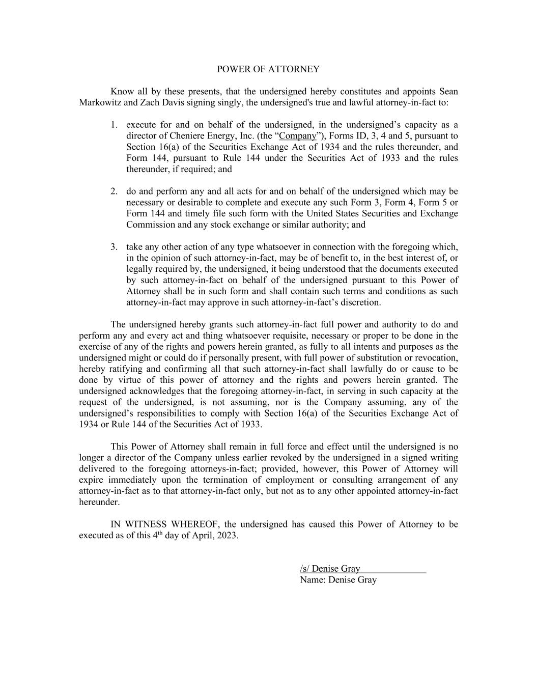 POWER OF ATTORNEY Know all by these presents, that the undersigned hereby constitutes and appoints Sean Markowitz and Zach Davis signing singly, the undersigned's true and lawful attorney-in-fact to: 1. execute for and on behalf of the undersigned, in the undersigned’s capacity as a director of Cheniere Energy, Inc. (the “Company”), Forms ID, 3, 4 and 5, pursuant to Section 16(a) of the Securities Exchange Act of 1934 and the rules thereunder, and Form 144, pursuant to Rule 144 under the Securities Act of 1933 and the rules thereunder, if required; and 2. do and perform any and all acts for and on behalf of the undersigned which may be necessary or desirable to complete and execute any such Form 3, Form 4, Form 5 or Form 144 and timely file such form with the United States Securities and Exchange Commission and any stock exchange or similar authority; and 3. take any other action of any type whatsoever in connection with the foregoing which, in the opinion of such attorney-in-fact, may be of benefit to, in the best interest of, or legally required by, the undersigned, it being understood that the documents executed by such attorney-in-fact on behalf of the undersigned pursuant to this Power of Attorney shall be in such form and shall contain such terms and conditions as such attorney-in-fact may approve in such attorney-in-fact’s discretion. The undersigned hereby grants such attorney-in-fact full power and authority to do and perform any and every act and thing whatsoever requisite, necessary or proper to be done in the exercise of any of the rights and powers herein granted, as fully to all intents and purposes as the undersigned might or could do if personally present, with full power of substitution or revocation, hereby ratifying and confirming all that such attorney-in-fact shall lawfully do or cause to be done by virtue of this power of attorney and the rights and powers herein granted. The undersigned acknowledges that the foregoing attorney-in-fact, in serving in such capacity at the request of the undersigned, is not assuming, nor is the Company assuming, any of the undersigned’s responsibilities to comply with Section 16(a) of the Securities Exchange Act of 1934 or Rule 144 of the Securities Act of 1933. This Power of Attorney shall remain in full force and effect until the undersigned is no longer a director of the Company unless earlier revoked by the undersigned in a signed writing delivered to the foregoing attorneys-in-fact; provided, however, this Power of Attorney will expire immediately upon the termination of employment or consulting arrangement of any attorney-in-fact as to that attorney-in-fact only, but not as to any other appointed attorney-in-fact hereunder. IN WITNESS WHEREOF, the undersigned has caused this Power of Attorney to be executed as of this 4th day of April, 2023. /s/ Denise Gray Name: Denise Gray