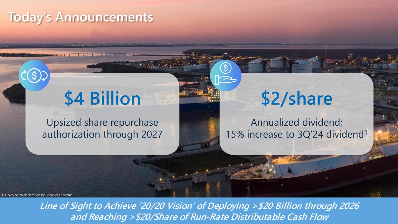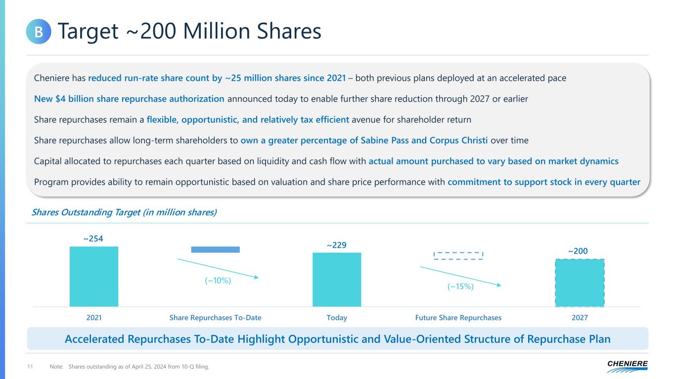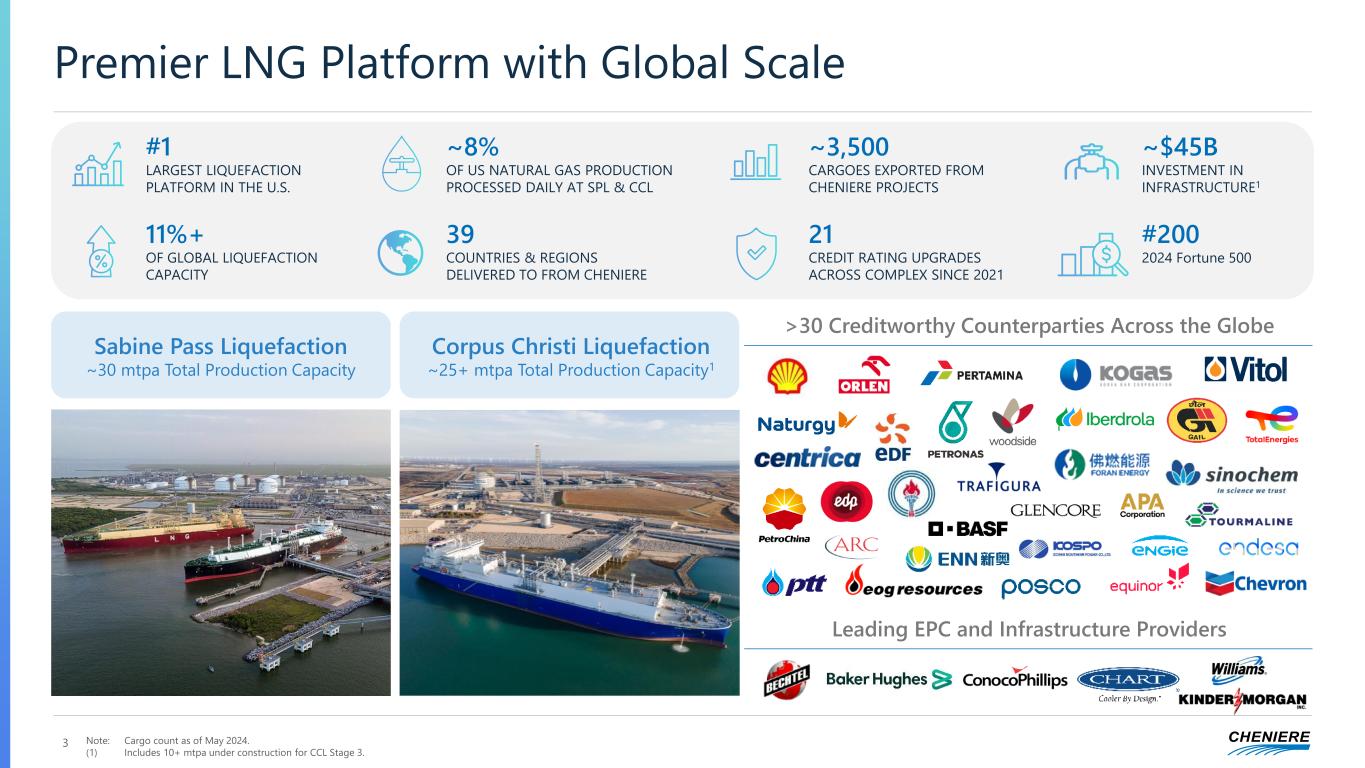Forward-Looking Statements This presentation contains certain statements that are, or may be deemed to be, “forward-looking statements” within the meaning of Section 27A of the Securities Act of 1933, as amended, and Section 21E of the Securities Exchange Act of 1934, as amended. All statements, other than statements of historical or present facts or conditions, included or incorporated by reference herein are “forward- looking statements.” Included among “forward-looking statements” are, among other things: • statements regarding the ability of Cheniere Energy Partners, L.P. to pay or increase distributions to its unitholders or Cheniere Energy, Inc. to pay or increase dividends to its shareholders or participate in share or unit buybacks; • statements regarding Cheniere Energy, Inc.’s or Cheniere Energy Partners, L.P.’s expected receipt of cash distributions from their respective subsidiaries; • statements that Cheniere Energy Partners, L.P. expects to commence or complete construction of its proposed liquefied natural gas (“LNG”) terminals, liquefaction facilities, pipeline facilities or other projects, or any expansions or portions thereof, by certain dates or at all; • statements that Cheniere Energy, Inc. expects to commence or complete construction of its proposed LNG terminals, liquefaction facilities, pipeline facilities or other projects, or any expansions or portions thereof, by certain dates or at all; • statements regarding future levels of domestic and international natural gas production, supply or consumption or future levels of LNG imports into or exports from North America and other countries worldwide, or purchases of natural gas, regardless of the source of such information, or the transportation or other infrastructure, or demand for and prices related to natural gas, LNG or other hydrocarbon products; • statements regarding any financing transactions or arrangements, or ability to enter into such transactions; • statements relating to Cheniere’s capital deployment, including intent, ability, extent, and timing of capital expenditures, debt repayment, dividends, share repurchases and execution on the capital allocation plan; • statements regarding our future sources of liquidity and cash requirements; • statements relating to the construction of our proposed liquefaction facilities and natural gas liquefaction trains (“Trains”) and the construction of our pipelines, including statements concerning the engagement of any engineering, procurement and construction ("EPC") contractor or other contractor and the anticipated terms and provisions of any agreement with any EPC or other contractor, and anticipated costs related thereto; • statements regarding any agreement to be entered into or performed substantially in the future, including any revenues anticipated to be received and the anticipated timing thereof, and statements regarding the amounts of total LNG regasification, natural gas, liquefaction or storage capacities that are, or may become, subject to contracts; • statements regarding counterparties to our commercial contracts, construction contracts and other contracts; • statements regarding our planned development and construction of additional Trains or pipelines, including the financing of such Trains or pipelines; • statements that our Trains, when completed, will have certain characteristics, including amounts of liquefaction capacities; • statements regarding our business strategy, our strengths, our business and operation plans or any other plans, forecasts, projections or objectives, including anticipated revenues, capital expenditures, maintenance and operating costs, free cash flow, run rate SG&A estimates, cash flows, EBITDA, Consolidated Adjusted EBITDA, distributable cash flow, distributable cash flow per share and unit, deconsolidated debt outstanding, and deconsolidated contracted EBITDA, any or all of which are subject to change; • statements regarding projections of revenues, expenses, earnings or losses, working capital or other financial items; • statements relating to our goals, commitments and strategies in relation to environmental matters; • statements regarding legislative, governmental, regulatory, administrative or other public body actions, approvals, requirements, permits, applications, filings, investigations, proceedings or decisions; • statements regarding our anticipated LNG and natural gas marketing activities; and • any other statements that relate to non-historical or future information. These forward-looking statements are often identified by the use of terms and phrases such as “achieve,” “anticipate,” “believe,” “contemplate,” “continue,” “could,” “develop,” “estimate,” “example,” “expect,” “forecast,” “goals,” ”guidance,” “intend,” “may,” “opportunities,” “plan,” “potential,” “predict,” “project,” “propose,” “pursue,” “should,” “subject to,” “strategy,” “target,” “will,” and similar terms and phrases, or by use of future tense. Although we believe that the expectations reflected in these forward-looking statements are reasonable, they do involve assumptions, risks and uncertainties, and these expectations may prove to be incorrect. You should not place undue reliance on these forward-looking statements, which speak only as of the date of this presentation. Our actual results could differ materially from those anticipated in these forward-looking statements as a result of a variety of factors, including those discussed in “Risk Factors” in the Cheniere Energy, Inc. and Cheniere Energy Partners, L.P. Annual Reports on Form 10-K filed with the SEC on February 22, 2024, which are incorporated by reference into this presentation. All forward-looking statements attributable to us or persons acting on our behalf are expressly qualified in their entirety by t