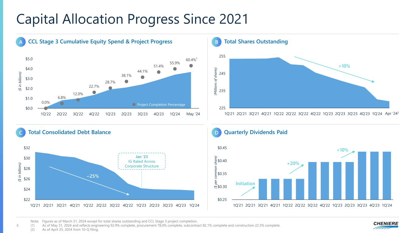 ‘20/20 Vision’ Capital Allocation Plan: Ahead of Schedule 5 T a rg e t (2 0 2 2 ) P ro g re ss DEBT PAYDOWN ▪ ~4x Debt / EBITDA ▪ Investment Grade Ratings across Corporate Structure ▪ Repaid ~$4 Billion ▪ Achieved Investment Grade Ratings SHARE REPURCHASES ▪ ~10% of LNG Market Cap ▪ Incremental Buyback Once Completed ▪ Set to Deploy $4 Billion in ~2 years ▪ >20 Million Shares Repurchased2 ▪ ~10% Annual Growth Through Mid-2020s ▪ ~20% Payout Ratio1 DIVIDEND ▪ ~$1 Billion of Cumulative Dividends Paid3 ▪ 10% Annual Increases ▪ Stage 3 Expected to Come Online Starting 2025 ▪ Development at Corpus and Sabine to be Pursued GROWTH ▪ Stage 3 Expected to Produce First LNG in 2024 ▪ Future FIDs Planned For 2025 and 2026 (1) Payout ratio consists of full-year dividends divided by full-year DCF. (2) Under current authorization only and as of April 25, 2024. (3) Since 2021. A B C D ✓✓ ✓✓ >$20 >$20