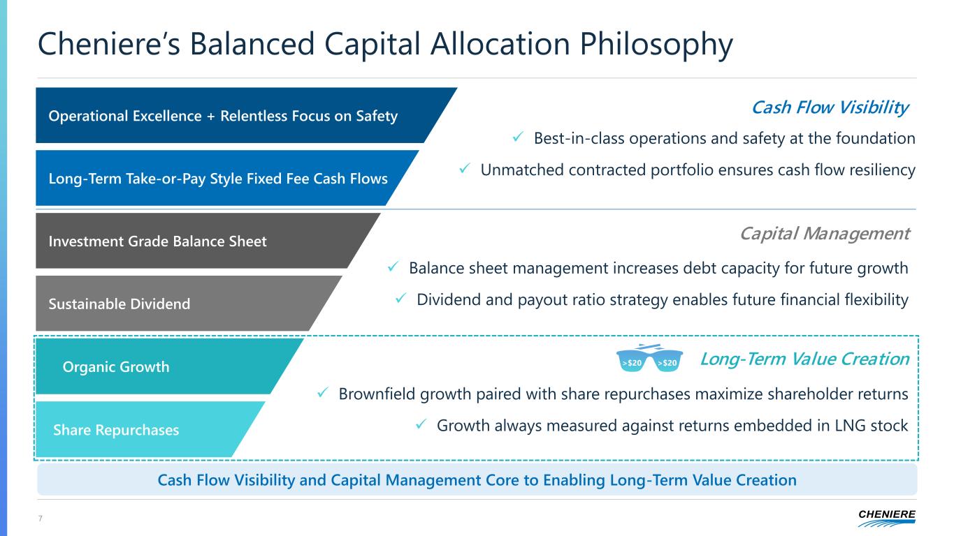 Capital Allocation Progress Since 2021 6 Note: Figures as of March 31, 2024 except for total shares outstanding and CCL Stage 3 project completion. (1) As of May 31, 2024 and reflects engineering 92.9% complete, procurement 78.0% complete, subcontract 82.1% complete and construction 22.3% complete. (2) As of April 25, 2024 from 10-Q filing. Total Shares Outstanding (M il li o n s o f sh a re s) 225 235 245 255 1Q'21 2Q'21 3Q'21 4Q'21 1Q'22 2Q'22 3Q'22 4Q'22 1Q'23 2Q'23 3Q'23 4Q'23 1Q'24 Today >10% Apr ’242 CCL Stage 3 Cumulative Equity Spend & Project Progress ($ i n b il li o n s) 0.0% 6.8% 12.0% 22.7% 28.7% 38.1% 44.1% 51.4% 55.9% 60.4% $0.0 $1.0 $2.0 $3.0 $4.0 $5.0 1Q'22 2Q'22 3Q'22 4Q'22 1Q'23 2Q'23 3Q'23 4Q'23 1Q'24 Today Project Completion Percentage May ‘24 1 Quarterly Dividends Paid ($ p e r co m m o n s h a re ) $0.25 $0.30 $0.35 $0.40 $0.45 1Q'21 2Q'21 3Q'21 4Q'21 1Q'22 2Q'22 3Q'22 4Q'22 1Q'23 2Q'23 3Q'23 4Q'23 1Q'24 +20% +10% Initiation $22 $24 $26 $28 $30 $32 1Q'21 2Q'21 3Q'21 4Q'21 1Q'22 2Q'22 3Q'22 4Q'22 1Q'23 2Q'23 3Q'23 4Q'23 1Q'24 Total Consolidated Debt Balance ($ i n b il li o n s) ~25% Jan ‘23 IG Rated Across Corporate Structure A B C D
