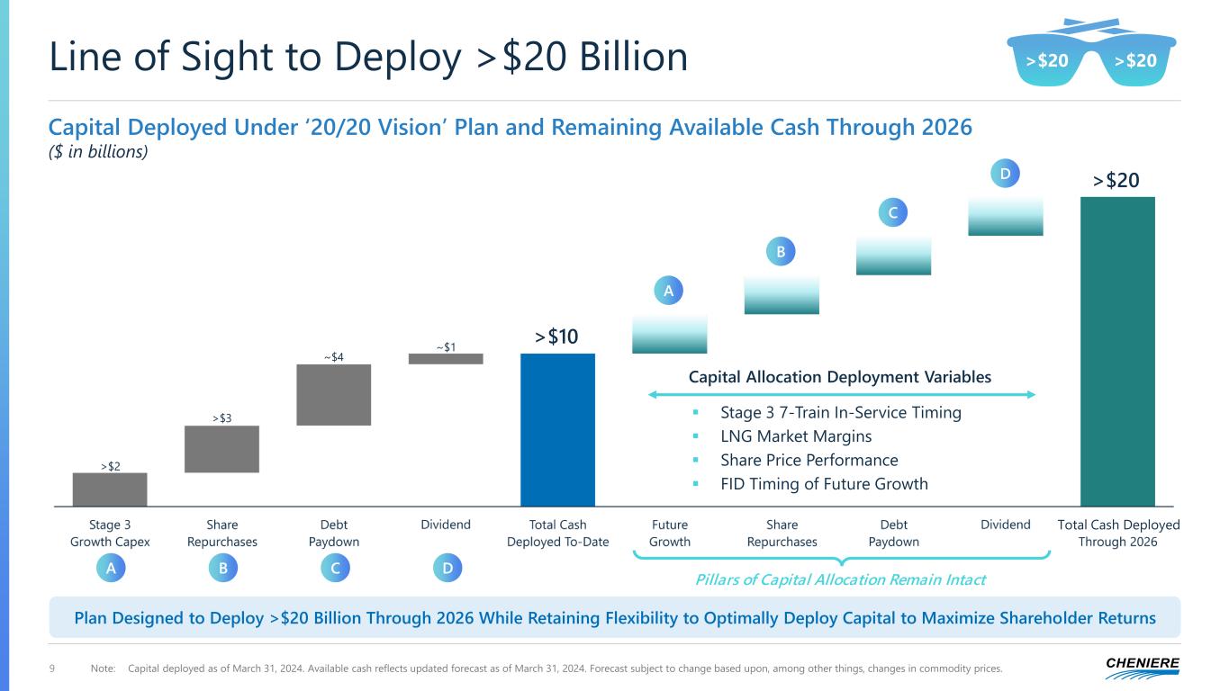 Today’s Updates Under ‘20/20 Vision’ 8 (1) Subject to declaration by Board of Directors. (2) Payout ratio consists of full-year dividends divided by full-year DCF. Significant Cash Flow Generation and Visibility Enable Follow-Through on All-of-the-Above Capital Allocation Plan Accretive Growth ▪ Committed to financially disciplined, brownfield growth accretive to stock ▪ Target FID of Midscale Trains 8 & 9 in 2025 ▪ Target FID of SPL Expansion Project in 2026 Long-Term Sustainable IG Balance Sheet ▪ Sustain long-term, run-rate leverage of <4x ▪ Target ‘BBB’ corporate credit ratings over time ▪ Increase future debt capacity for LNG build-out and enhance free cash flow throughout Share Repurchase Program ▪ Upsized authorization by additional $4 billion through 2027 ▪ Target repurchasing another ~10% of LNG market cap ▪ Remain opportunistic with track to reach ~200 million shares outstanding Growing Dividend ▪ Increase annual dividend by ~15% to $2.00/share for 3Q’241 ▪ Plan to continue ~10% annual growth rate guidance to achieve ~20% payout ratio2 later this decade ▪ Competitive and growing shareholder return in combination with share repurchases >$20 >$20 A B C D