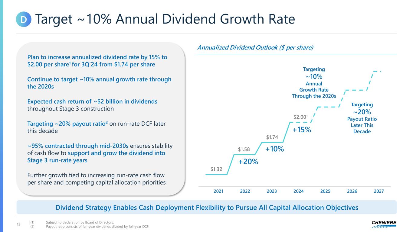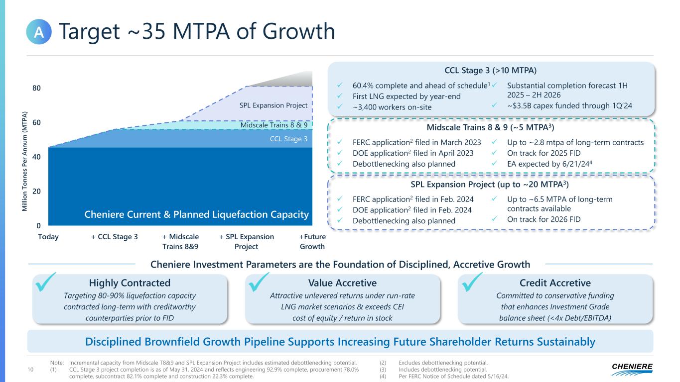 0 20 40 60 80 Today + CCL Stage 3 + Midscale Trains 8&9 + SPL Expansion Project +Future Growth Target ~35 MTPA of Growth 10 M il li o n T o n n e s P e r A n n u m ( M T P A ) Note: Incremental capacity from Midscale T8&9 and SPL Expansion Project includes estimated debottlenecking potential. (1) CCL Stage 3 project completion is as of May 31, 2024 and reflects engineering 92.9% complete, procurement 78.0% complete, subcontract 82.1% complete and construction 22.3% complete. (2) Excludes debottlenecking potential. (3) Includes debottlenecking potential. (4) Per FERC Notice of Schedule dated 5/16/24. Cheniere Current & Planned Liquefaction Capacity Cheniere Investment Parameters are the Foundation of Disciplined, Accretive Growth Highly Contracted Targeting 80-90% liquefaction capacity contracted long-term with creditworthy counterparties prior to FID Value Accretive Attractive unlevered returns under run-rate LNG market scenarios & exceeds CEI cost of equity / return in stock Credit Accretive Committed to conservative funding that enhances Investment Grade balance sheet (<4x Debt/EBITDA) CCL Stage 3 Midscale Trains 8 & 9 SPL Expansion Project A Disciplined Brownfield Growth Pipeline Supports Increasing Future Shareholder Returns Sustainably SPL Expansion Project (up to ~20 MTPA3) ✓ FERC application2 filed in Feb. 2024 ✓ DOE application2 filed in Feb. 2024 ✓ Debottlenecking also planned ✓ Up to ~6.5 MTPA of long-term contracts available ✓ On track for 2026 FID Midscale Trains 8 & 9 (~5 MTPA3) ✓ FERC application2 filed in March 2023 ✓ DOE application2 filed in April 2023 ✓ Debottlenecking also planned ✓ Up to ~2.8 mtpa of long-term contracts ✓ On track for 2025 FID ✓ EA expected by 6/21/244 CCL Stage 3 (>10 MTPA) ✓ 60.4% complete and ahead of schedule1 ✓ First LNG expected by year-end ✓ ~3,400 workers on-site ✓ Substantial completion forecast 1H 2025 – 2H 2026 ✓ ~$3.5B capex funded through 1Q’24 ✓ ✓ ✓