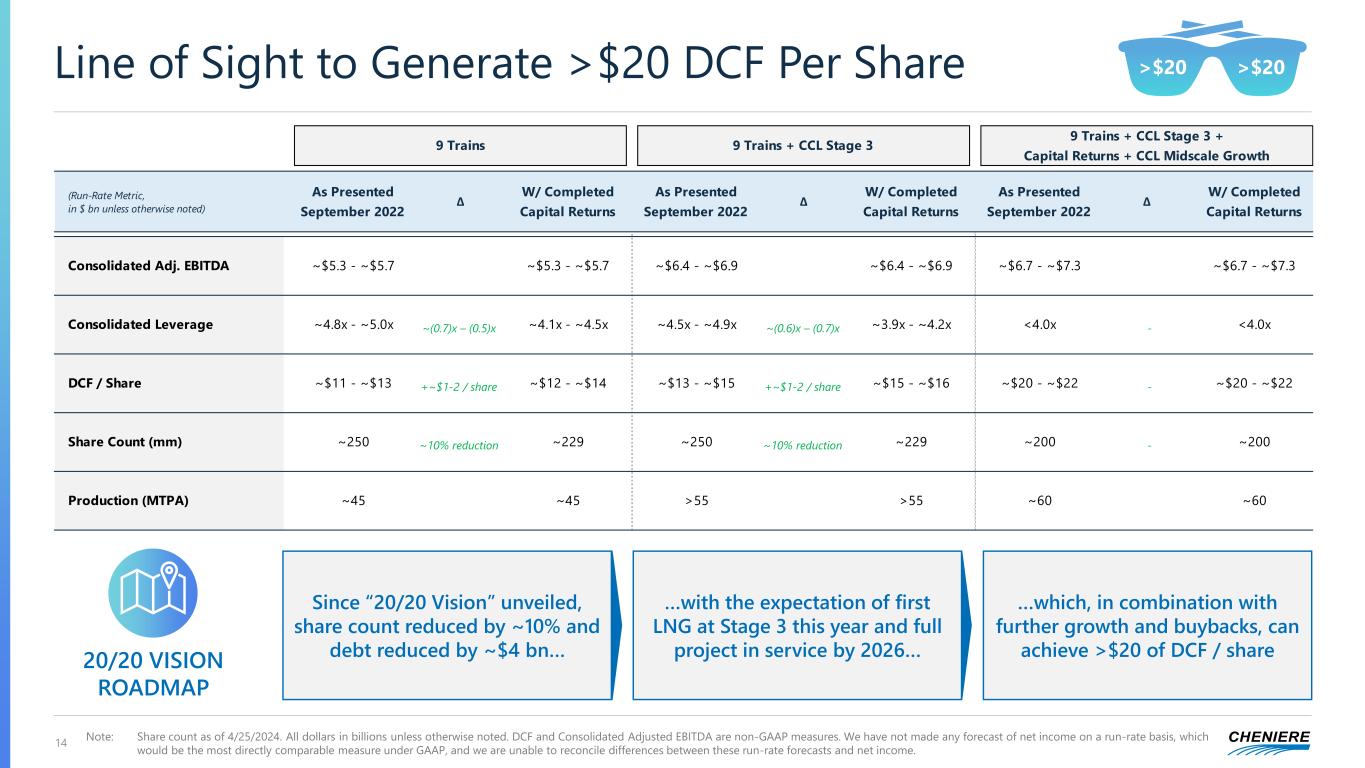 Since “20/20 Vision” unveiled, share count reduced by ~10% and debt reduced by ~$4 bn… …with the expectation of first LNG at Stage 3 this year and full project in service by 2026… …which, in combination with further growth and buybacks, can achieve >$20 of DCF / share Line of Sight to Generate >$20 DCF Per Share 14 20/20 VISION ROADMAP Note: Share count as of 4/25/2024. All dollars in billions unless otherwise noted. DCF and Consolidated Adjusted EBITDA are non-GAAP measures. We have not made any forecast of net income on a run-rate basis, which would be the most directly comparable measure under GAAP, and we are unable to reconcile differences between these run-rate forecasts and net income. ~(0.7)x – (0.5)x +~$1-2 / share ~10% reduction ~(0.6)x – (0.7)x +~$1-2 / share ~10% reduction - - - 9 Trains 9 Trains + CCL Stage 3 9 Trains + CCL Stage 3 + Capital Returns + CCL Midscale Growth (Run-Rate Metric, in $ bn unless otherwise noted) As Presented September 2022 ∆ W/ Completed Capital Returns As Presented September 2022 ∆ W/ Completed Capital Returns As Presented September 2022 ∆ W/ Completed Capital Returns Consolidated Adj. EBITDA ~$5.3 - ~$5.7 ~$5.3 - ~$5.7 ~$6.4 - ~$6.9 ~$6.4 - ~$6.9 ~$6.7 - ~$7.3 ~$6.7 - ~$7.3 Consolidated Leverage ~4.8x - ~5.0x ~4.1x - ~4.5x ~4.5x - ~4.9x ~3.9x - ~4.2x <4.0x <4.0x DCF / Share ~$11 - ~$13 ~$12 - ~$14 ~$13 - ~$15 ~$15 - ~$16 ~$20 - ~$22 ~$20 - ~$22 Share Count (mm) ~250 ~229 ~250 ~229 ~200 ~200 Production (MTPA) ~45 ~45 >55 >55 ~60 ~60 >$20 >$20