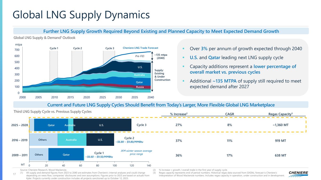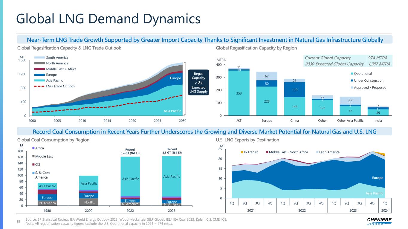 Cycle 2 Cycle 3 % Increase2 CAGR Regas Capacity3 27% 8% ~1,360 MT 37% 11% 919 MT 36% 17% 638 MT Global LNG Supply Dynamics 17 Further LNG Supply Growth Required Beyond Existing and Planned Capacity to Meet Expected Demand Growth Europe Global LNG Supply & Demand1 Outlook Current and Future LNG Supply Cycles Should Benefit from Today’s Larger, More Flexible Global LNG Marketplace Third LNG Supply Cycle vs. Previous Supply Cycles Source: Cheniere Research, Wood Mackenzie. (1) All supply and demand figures from 2023 to 2040 are estimates from Cheniere’s internal analyses and could change depending on news flow, companies' disclosures and own assumptions. Figures prior to 2023 are based on actuals from Kpler. Projects currently under construction includes all projects sanctioned up to October 12, 2023. (2) % increase = growth / overall trade in the first year of supply cycle. (3) Regas capacity represents end of period numbers. Historical regas data sourced from GIIGNL; forecast is Cheniere’s interpretation of Wood Mackenzie numbers. Includes regas capacity in operation, under construction and in development. 0 20 40 60 80 100 120 140 Qatar U.S./Aus. U.S./Qatar MT JKM winter season average price rangeCycle 1 ~$6.60 – $9.50/MMBtu Qatar Australia U.S. Others Others Qatar Australia U.S. Cycle 2 ~$6.80 – $9.80/MMBtu Cycle 32025 – 2028 2016 – 2019 2009 – 2011 ▪ Over 3% per annum of growth expected through 2040 ▪ U.S. and Qatar leading next LNG supply cycle ▪ Capacity additions represent a lower percentage of overall market vs. previous cycles ▪ Additional ~135 MTPA of supply still required to meet expected demand after 2027 Qatar Australia U.S. 0 100 200 300 400 500 600 700 2000 2005 2010 2015 2020 2025 2030 2035 2040 mtpa Russia Cycle 1 ~135 mtpa (2040) Cheniere LNG Trade Forecast Pre-FID Supply: Existing & Under Construction