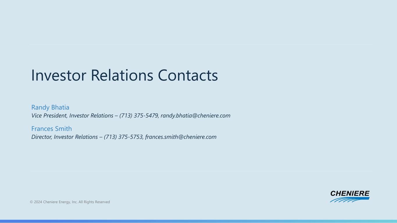 © 2024 Cheniere Energy, Inc. All Rights Reserved Investor Relations Contacts Randy Bhatia Vice President, Investor Relations – (713) 375-5479, randy.bhatia@cheniere.com Frances Smith Director, Investor Relations – (713) 375-5753, frances.smith@cheniere.com