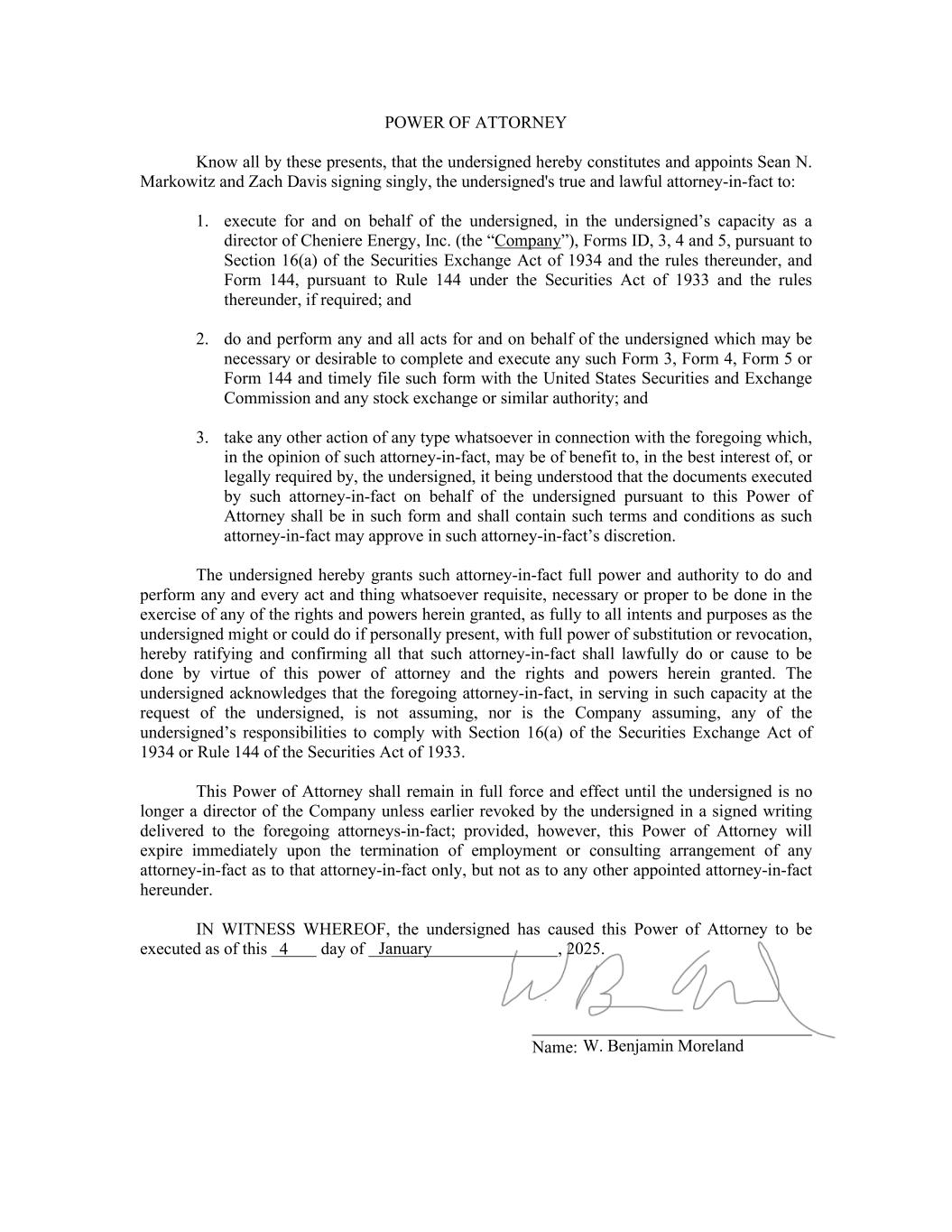 POWER OF ATTORNEY Know all by these presents, that the undersigned hereby constitutes and appoints Sean N. Markowitz and Zach Davis signing singly, the undersigned's true and lawful attorney-in-fact to: 1. execute for and on behalf of the undersigned, in the undersigned’s capacity as a director of Cheniere Energy, Inc. (the “Company”), Forms ID, 3, 4 and 5, pursuant to Section 16(a) of the Securities Exchange Act of 1934 and the rules thereunder, and Form 144, pursuant to Rule 144 under the Securities Act of 1933 and the rules thereunder, if required; and 2. do and perform any and all acts for and on behalf of the undersigned which may be necessary or desirable to complete and execute any such Form 3, Form 4, Form 5 or Form 144 and timely file such form with the United States Securities and Exchange Commission and any stock exchange or similar authority; and 3. take any other action of any type whatsoever in connection with the foregoing which, in the opinion of such attorney-in-fact, may be of benefit to, in the best interest of, or legally required by, the undersigned, it being understood that the documents executed by such attorney-in-fact on behalf of the undersigned pursuant to this Power of Attorney shall be in such form and shall contain such terms and conditions as such attorney-in-fact may approve in such attorney-in-fact’s discretion. The undersigned hereby grants such attorney-in-fact full power and authority to do and perform any and every act and thing whatsoever requisite, necessary or proper to be done in the exercise of any of the rights and powers herein granted, as fully to all intents and purposes as the undersigned might or could do if personally present, with full power of substitution or revocation, hereby ratifying and confirming all that such attorney-in-fact shall lawfully do or cause to be done by virtue of this power of attorney and the rights and powers herein granted. The undersigned acknowledges that the foregoing attorney-in-fact, in serving in such capacity at the request of the undersigned, is not assuming, nor is the Company assuming, any of the undersigned’s responsibilities to comply with Section 16(a) of the Securities Exchange Act of 1934 or Rule 144 of the Securities Act of 1933. This Power of Attorney shall remain in full force and effect until the undersigned is no longer a director of the Company unless earlier revoked by the undersigned in a signed writing delivered to the foregoing attorneys-in-fact; provided, however, this Power of Attorney will expire immediately upon the termination of employment or consulting arrangement of any attorney-in-fact as to that attorney-in-fact only, but not as to any other appointed attorney-in-fact hereunder. IN WITNESS WHEREOF, the undersigned has caused this Power of Attorney to be executed as of this day of , 2025. Name: W. Benjamin Moreland 4 January