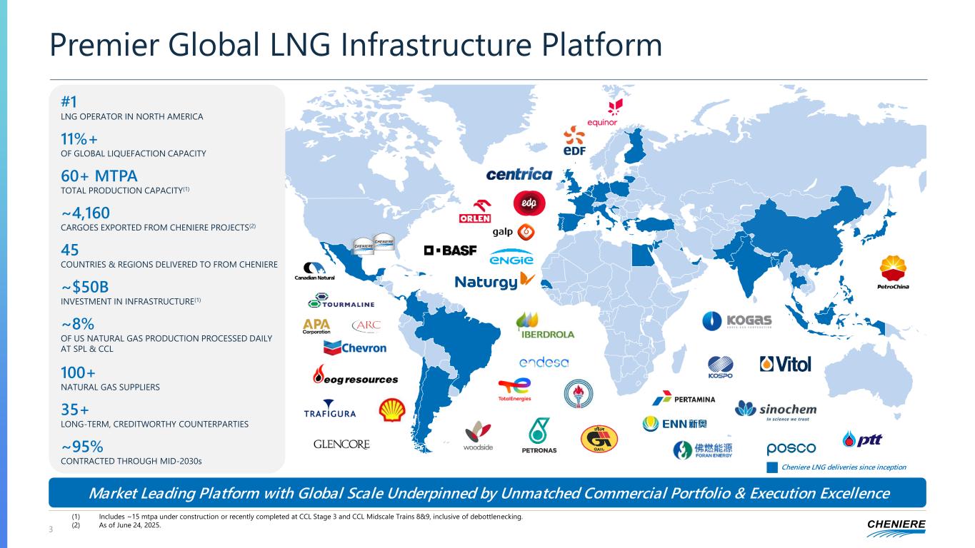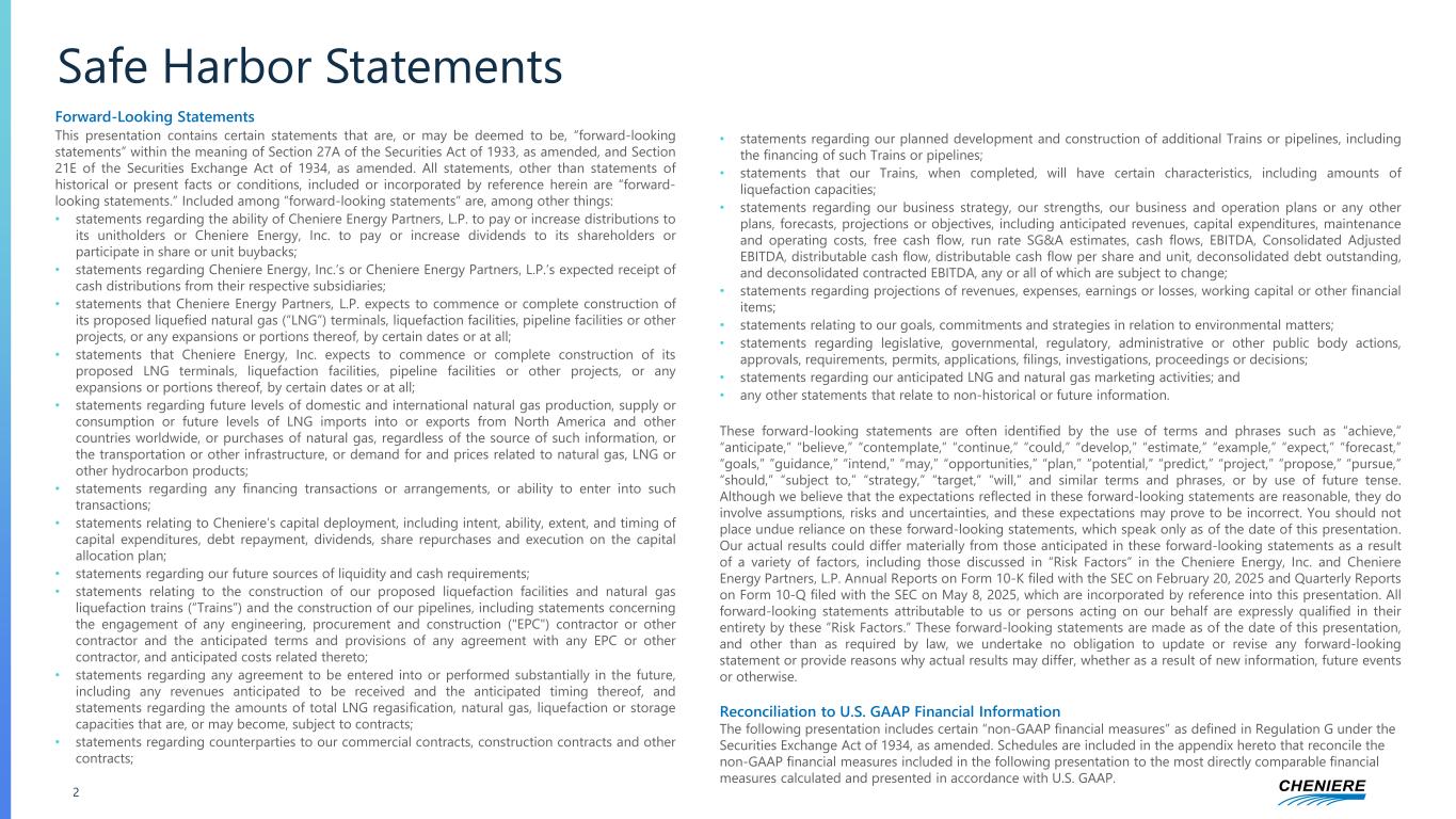 Forward-Looking Statements This presentation contains certain statements that are, or may be deemed to be, “forward-looking statements” within the meaning of Section 27A of the Securities Act of 1933, as amended, and Section 21E of the Securities Exchange Act of 1934, as amended. All statements, other than statements of historical or present facts or conditions, included or incorporated by reference herein are “forward- looking statements.” Included among “forward-looking statements” are, among other things: • statements regarding the ability of Cheniere Energy Partners, L.P. to pay or increase distributions to its unitholders or Cheniere Energy, Inc. to pay or increase dividends to its shareholders or participate in share or unit buybacks; • statements regarding Cheniere Energy, Inc.’s or Cheniere Energy Partners, L.P.’s expected receipt of cash distributions from their respective subsidiaries; • statements that Cheniere Energy Partners, L.P. expects to commence or complete construction of its proposed liquefied natural gas (“LNG”) terminals, liquefaction facilities, pipeline facilities or other projects, or any expansions or portions thereof, by certain dates or at all; • statements that Cheniere Energy, Inc. expects to commence or complete construction of its proposed LNG terminals, liquefaction facilities, pipeline facilities or other projects, or any expansions or portions thereof, by certain dates or at all; • statements regarding future levels of domestic and international natural gas production, supply or consumption or future levels of LNG imports into or exports from North America and other countries worldwide, or purchases of natural gas, regardless of the source of such information, or the transportation or other infrastructure, or demand for and prices related to natural gas, LNG or other hydrocarbon products; • statements regarding any financing transactions or arrangements, or ability to enter into such transactions; • statements relating to Cheniere’s capital deployment, including intent, ability, extent, and timing of capital expenditures, debt repayment, dividends, share repurchases and execution on the capital allocation plan; • statements regarding our future sources of liquidity and cash requirements; • statements relating to the construction of our proposed liquefaction facilities and natural gas liquefaction trains (“Trains”) and the construction of our pipelines, including statements concerning the engagement of any engineering, procurement and construction ("EPC") contractor or other contractor and the anticipated terms and provisions of any agreement with any EPC or other contractor, and anticipated costs related thereto; • statements regarding any agreement to be entered into or performed substantially in the future, including any revenues anticipated to be received and the anticipated timing thereof, and statements regarding the amounts of total LNG regasification, natural gas, liquefaction or storage capacities that are, or may become, subject to contracts; • statements regarding counterparties to our commercial contracts, construction contracts and other contracts; • statements regarding our planned development and construction of additional Trains or pipelines, including the financing of such Trains or pipelines; • statements that our Trains, when completed, will have certain characteristics, including amounts of liquefaction capacities; • statements regarding our business strategy, our strengths, our business and operation plans or any other plans, forecasts, projections or objectives, including anticipated revenues, capital expenditures, maintenance and operating costs, free cash flow, run rate SG&A estimates, cash flows, EBITDA, Consolidated Adjusted EBITDA, distributable cash flow, distributable cash flow per share and unit, deconsolidated debt outstanding, and deconsolidated contracted EBITDA, any or all of which are subject to change; • statements regarding projections of revenues, expenses, earnings or losses, working capital or other financial items; • statements relating to our goals, commitments and strategies in relation to environmental matters; • statements regarding legislative, governmental, regulatory, administrative or other public body actions, approvals, requirements, permits, applications, filings, investigations, proceedings or decisions; • statements regarding our anticipated LNG and natural gas marketing activities; and • any other statements that relate to non-historical or future information. These forward-looking statements are often identified by the use of terms and phrases such as “achieve,” “anticipate,” “believe,” “contemplate,” “continue,” “could,” “develop,” “estimate,” “example,” “expect,” “forecast,” “goals,” ”guidance,” “intend,” “may,” “opportunities,” “plan,” “potential,” “predict,” “project,” “propose,” “pursue,” “should,” “subject to,” “strategy,” “target,” “will,” and similar terms and phrases, or by use of future tense. Although we believe that the expectations reflected in these forward-looking statements are reasonable, they do involve assumptions, risks and uncertainties, and these expectations may prove to be incorrect. You should not place undue reliance on these forward-looking statements, which speak only as of the date of this presentation. Our actual results could differ materially from those anticipated in these forward-looking statements as a result of a variety of factors, including those discussed in “Risk Factors” in the Cheniere Energy, Inc. and Cheniere Energy Partners, L.P. Annual Reports on Form 10-K filed with the SEC on February 20, 2025 and Quarterly Reports on Form 10-Q filed with the SEC on May 8, 2025, which are incorporated by reference into this presentation. All forward-looking statements attributable to us or person