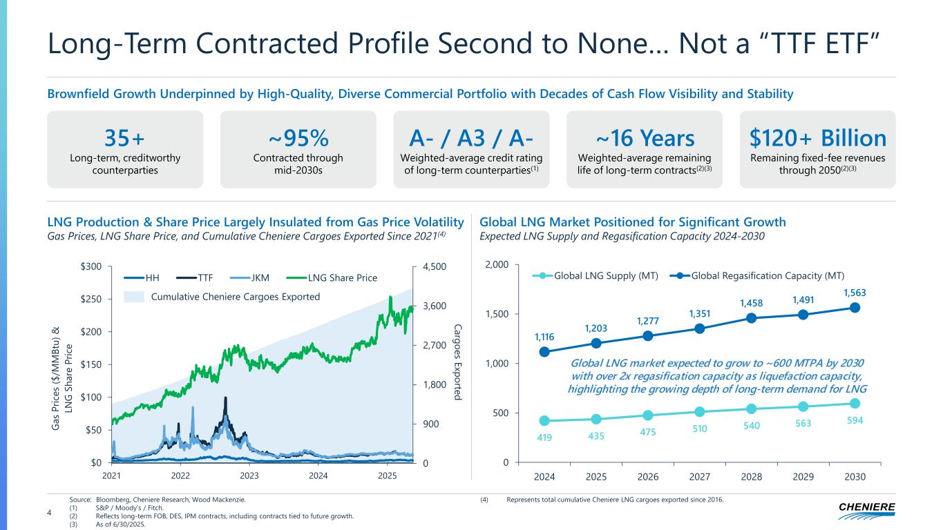 Premier Global LNG Infrastructure Platform 3 Market Leading Platform with Global Scale Underpinned by Unmatched Commercial Portfolio & Execution Excellence ~8% OF US NATURAL GAS PRODUCTION PROCESSED DAILY AT SPL & CCL 11%+ OF GLOBAL LIQUEFACTION CAPACITY 35+ LONG-TERM, CREDITWORTHY COUNTERPARTIES 100+ NATURAL GAS SUPPLIERS ~95% CONTRACTED THROUGH MID-2030s 60+ MTPA TOTAL PRODUCTION CAPACITY(1) #1 LNG OPERATOR IN NORTH AMERICA (1) Includes ~15 mtpa under construction or recently completed at CCL Stage 3 and CCL Midscale Trains 8&9, inclusive of debottlenecking. (2) As of June 24, 2025. ~$50B INVESTMENT IN INFRASTRUCTURE(1) ~4,160 CARGOES EXPORTED FROM CHENIERE PROJECTS(2) Cheniere LNG deliveries since inception 45 COUNTRIES & REGIONS DELIVERED TO FROM CHENIERE