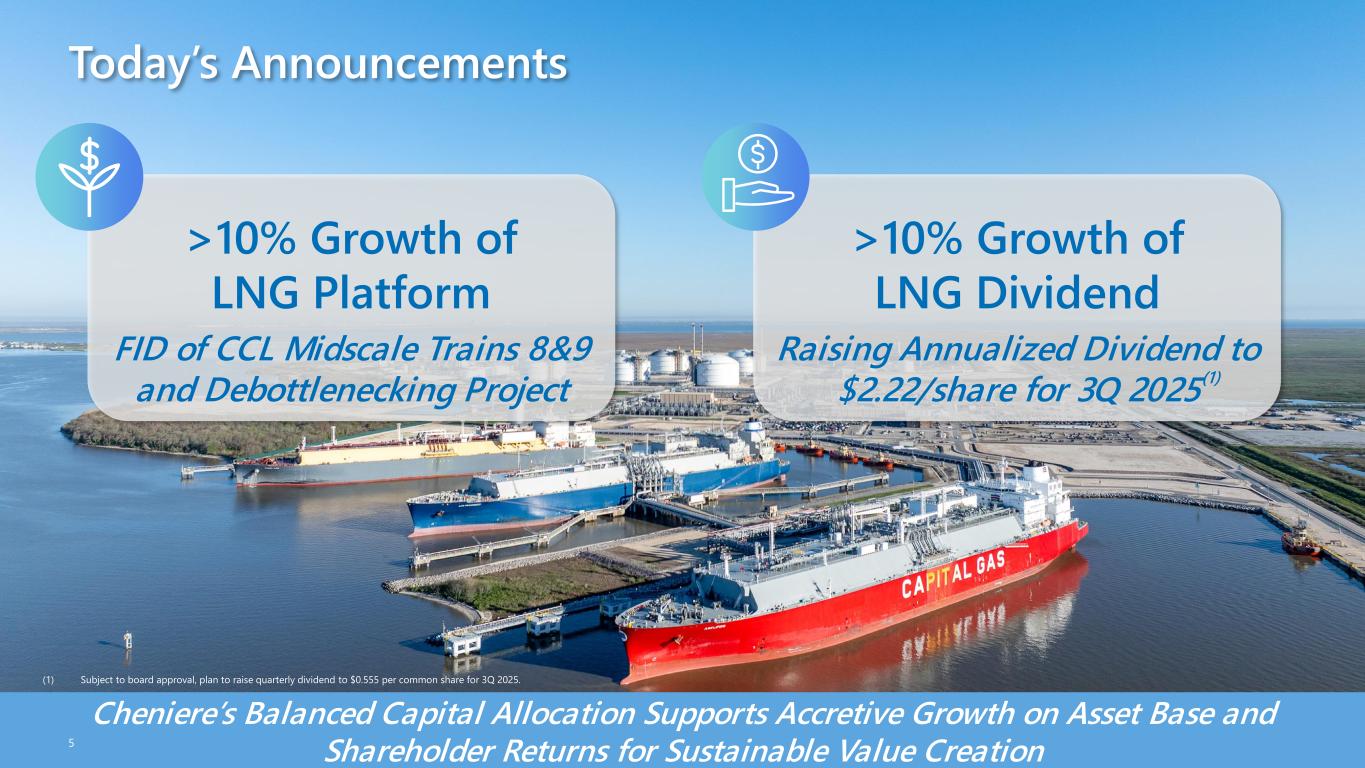 419 435 475 510 540 563 594 1,116 1,203 1,277 1,351 1,458 1,491 1,563 0 500 1,000 1,500 2,000 2024 2025 2026 2027 2028 2029 2030 Global LNG Supply (MT) Global Regasification Capacity (MT) 0 900 1,800 2,700 3,600 4,500 $0 $50 $100 $150 $200 $250 $300 2021 2022 2023 2024 2025 G a s P ri ce s ($ /M M B tu ) & L N G S h a re P ri ce HH TTF JKM LNG Share Price Source: Bloomberg, Cheniere Research, Wood Mackenzie. (1) S&P / Moody’s / Fitch. (2) Reflects long-term FOB, DES, IPM contracts, including contracts tied to future growth. (3) As of 6/30/2025. (4) Represents total cumulative Cheniere LNG cargoes exported since 2016. 4 Long-Term Contracted Profile Second to None… Not a “TTF ETF” Brownfield Growth Underpinned by High-Quality, Diverse Commercial Portfolio with Decades of Cash Flow Visibility and Stability 35+ Long-term, creditworthy counterparties ~95% Contracted through mid-2030s A- / A3 / A- Weighted-average credit rating of long-term counterparties(1) ~16 Years Weighted-average remaining life of long-term contracts(2)(3) $120+ Billion Remaining fixed-fee revenues through 2050(2)(3) Global LNG Market Positioned for Significant Growth Expected LNG Supply and Regasification Capacity 2024-2030 LNG Production & Share Price Largely Insulated from Gas Price Volatility Gas Prices, LNG Share Price, and Cumulative Cheniere Cargoes Exported Since 2021(4) Global LNG market expected to grow to ~600 MTPA by 2030 with over 2x regasification capacity as liquefaction capacity, highlighting the growing depth of long-term demand for LNG Cumulative Cheniere Cargoes Exported C a rg o e s E xp o rte d