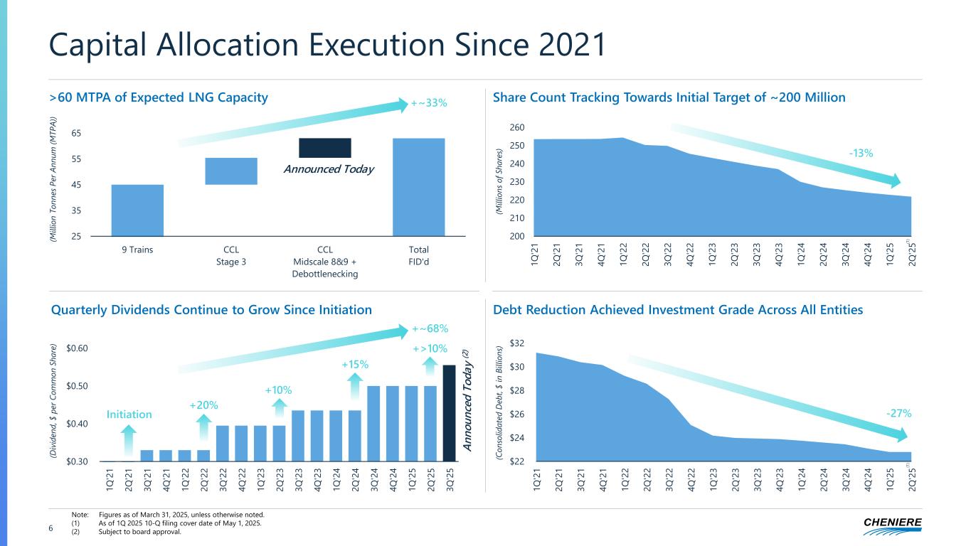 Today’s Announcements >10% Growth of LNG Platform FID of CCL Midscale Trains 8&9 and Debottlenecking Project Cheniere’s Balanced Capital Allocation Supports Accretive Growth on Asset Base and Shareholder Returns for Sustainable Value Creation >10% Growth of LNG Dividend Raising Annualized Dividend to $2.22/share for 3Q 2025 5 (1) Subject to board approval, plan to raise quarterly dividend to $0.555 per common share for 3Q 2025. (1)