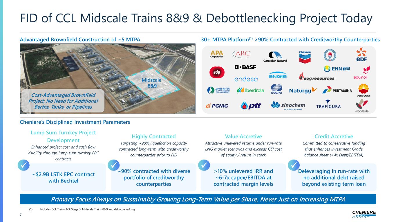 Note: Figures as of March 31, 2025, unless otherwise noted. (1) As of 1Q 2025 10-Q filing cover date of May 1, 2025. (2) Subject to board approval.6 Capital Allocation Execution Since 2021 Share Count Tracking Towards Initial Target of ~200 Million>60 MTPA of Expected LNG Capacity Debt Reduction Achieved Investment Grade Across All Entities (M il li o n T o n n e s P e r A n n u m ( M T P A )) (M il li o n s o f S h a re s) 200 210 220 230 240 250 260 1 Q '2 1 2 Q '2 1 3 Q '2 1 4 Q '2 1 1 Q '2 2 2 Q '2 2 3 Q '2 2 4 Q '2 2 1 Q '2 3 2 Q '2 3 3 Q '2 3 4 Q '2 3 1 Q '2 4 2 Q '2 4 3 Q '2 4 4 Q '2 4 1 Q '2 5 2 Q '2 5 -13% Quarterly Dividends Continue to Grow Since Initiation (D iv id e n d , $ p e r C o m m o n S h a re ) A n n o u n ce d T o d a y (2 ) $0.30 $0.40 $0.50 $0.60 1 Q '2 1 2 Q '2 1 3 Q '2 1 4 Q '2 1 1 Q '2 2 2 Q '2 2 3 Q '2 2 4 Q '2 2 1 Q '2 3 2 Q '2 3 3 Q '2 3 4 Q '2 3 1 Q '2 4 2 Q '2 4 3 Q '2 4 4 Q '2 4 1 Q '2 5 2 Q '2 5 3 Q '2 5 Initiation +20% +10% +15% +>10% $22 $24 $26 $28 $30 $32 1 Q '2 1 2 Q '2 1 3 Q '2 1 4 Q '2 1 1 Q '2 2 2 Q '2 2 3 Q '2 2 4 Q '2 2 1 Q '2 3 2 Q '2 3 3 Q '2 3 4 Q '2 3 1 Q '2 4 2 Q '2 4 3 Q '2 4 4 Q '2 4 1 Q '2 5 2 Q '2 5 (C o n so li d a te d D e b t, $ i n B il li o n s) (1 ) (1 ) -27% +~33% Announced Today +~68% 25 35 45 55 65 9 Trains CCL Stage 3 CCL Midscale 8&9 + Debottlenecking Total FID'd