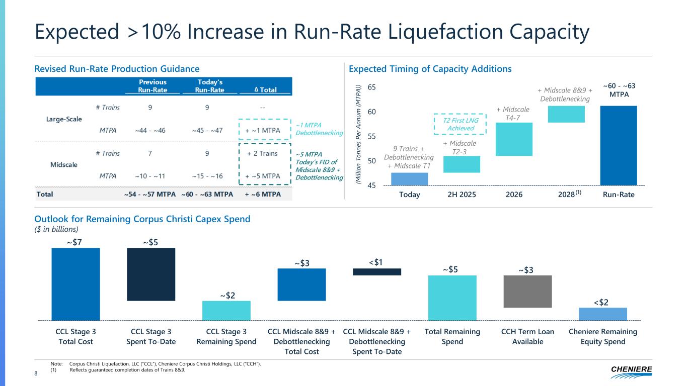 7 30+ MTPA Platform(1) >90% Contracted with Creditworthy CounterpartiesAdvantaged Brownfield Construction of ~5 MTPA FID of CCL Midscale Trains 8&9 & Debottlenecking Project Today Midscale 8&9 Cost-Advantaged Brownfield Project; No Need for Additional Berths, Tanks, or Pipelines Highly Contracted Targeting ~90% liquefaction capacity contracted long-term with creditworthy counterparties prior to FID ~90% contracted with diverse portfolio of creditworthy counterparties ✓ Lump Sum Turnkey Project Development Enhanced project cost and cash flow visibility through lump sum turnkey EPC contracts ~$2.9B LSTK EPC contract with Bechtel ✓ Value Accretive Attractive unlevered returns under run-rate LNG market scenarios and exceeds CEI cost of equity / return in stock >10% unlevered IRR and ~6-7x capex/EBITDA at contracted margin levels ✓ Credit Accretive Committed to conservative funding that enhances Investment Grade balance sheet (<4x Debt/EBITDA) Deleveraging in run-rate with no additional debt raised beyond existing term loan ✓ (1) Includes CCL Trains 1-3, Stage 3, Midscale Trains 8&9 and debottlenecking. Primary Focus Always on Sustainably Growing Long-Term Value per Share, Never Just on Increasing MTPA Cheniere’s Disciplined Investment Parameters