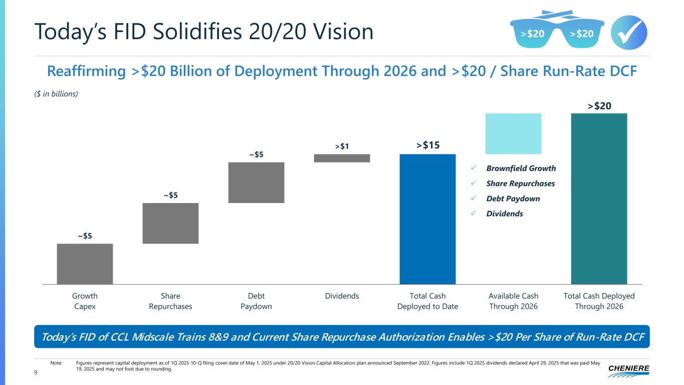 CCL Stage 3 Total Cost CCL Stage 3 Spent To-Date CCL Stage 3 Remaining Spend CCL Midscale 8&9 + Debottlenecking Total Cost CCL Midscale 8&9 + Debottlenecking Spent To-Date Total Remaining Spend CCH Term Loan Available Cheniere Remaining Equity Spend 8 Expected Timing of Capacity AdditionsRevised Run-Rate Production Guidance Outlook for Remaining Corpus Christi Capex Spend ($ in billions) Expected >10% Increase in Run-Rate Liquefaction Capacity ~$7 ~$5 ~$2 ~$3 <$1 ~$5 ~$3 <$2 45 50 55 60 65 Today 2H 2025 2026 2028 Run-Rate (M il li o n T o n n e s P e r A n n u m ( M T P A )) 9 Trains + Debottlenecking + Midscale T1 + Midscale T2-3 + Midscale T4-7 + Midscale 8&9 + Debottlenecking ~60 - ~63 MTPA (1) Note: Corpus Christi Liquefaction, LLC (“CCL”), Cheniere Corpus Christi Holdings, LLC (“CCH”). (1) Reflects guaranteed completion dates of Trains 8&9. ~1 MTPA Debottlenecking ~5 MTPA Today’s FID of Midscale 8&9 + Debottlenecking T2 First LNG Achieved