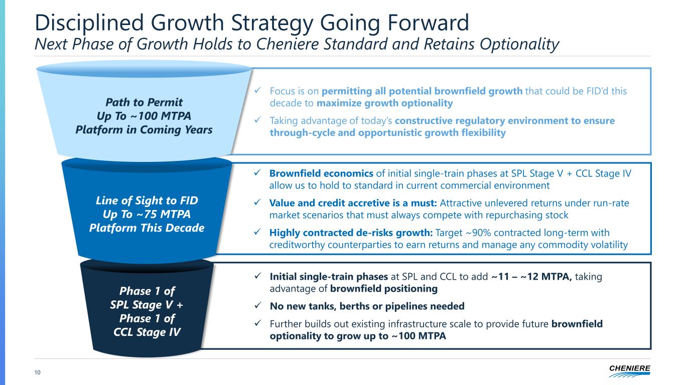 Note: Figures represent capital deployment as of 1Q 2025 10-Q filing cover date of May 1, 2025 under 20/20 Vision Capital Allocation plan announced September 2022. Figures include 1Q 2025 dividends declared April 29, 2025 that was paid May 19, 2025 and may not foot due to rounding. 9 Today’s FID Solidifies 20/20 Vision >$20 >$20 Reaffirming >$20 Billion of Deployment Through 2026 and >$20 / Share Run-Rate DCF ($ in billions) Today’s FID of CCL Midscale Trains 8&9 and Current Share Repurchase Authorization Enables >$20 Per Share of Run-Rate DCF ~$5 ~$5 ~$5 >$1 >$15 >$20 Growth Capex Share Repurchases Debt Paydown Dividends Total Cash Deployed to Date Available Cash Through 2026 Total Cash Deployed Through 2026 ✓ Brownfield Growth ✓ Share Repurchases ✓ Debt Paydown ✓ Dividends ✓