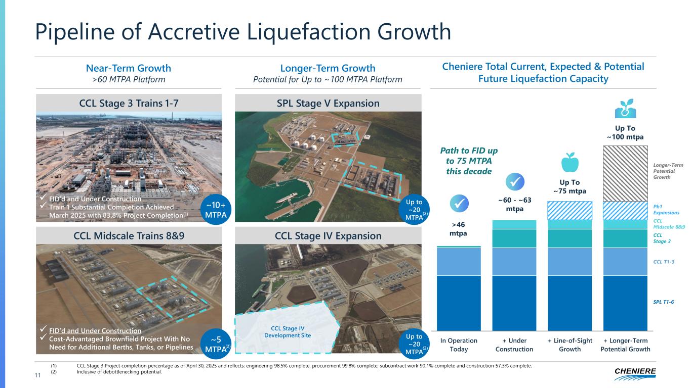 ✓ Focus is on permitting all potential brownfield growth that could be FID’d this decade to maximize growth optionality ✓ Taking advantage of today’s constructive regulatory environment to ensure through-cycle and opportunistic growth flexibility ✓ Brownfield economics of initial single-train phases at SPL Stage V + CCL Stage IV allow us to hold to standard in current commercial environment ✓ Value and credit accretive is a must: Attractive unlevered returns under run-rate market scenarios that must always compete with repurchasing stock ✓ Highly contracted de-risks growth: Target ~90% contracted long-term with creditworthy counterparties to earn returns and manage any commodity volatility ✓ Initial single-train phases at SPL and CCL to add ~11 – ~12 MTPA, taking advantage of brownfield positioning ✓ No new tanks, berths or pipelines needed ✓ Further builds out existing infrastructure scale to provide future brownfield optionality to grow up to ~100 MTPA Phase 1 of SPL Stage V + Phase 1 of CCL Stage IV Line of Sight to FID Up To ~75 MTPA Platform This Decade 10 Disciplined Growth Strategy Going Forward Next Phase of Growth Holds to Cheniere Standard and Retains Optionality Path to Permit Up To ~100 MTPA Platform in Coming Years