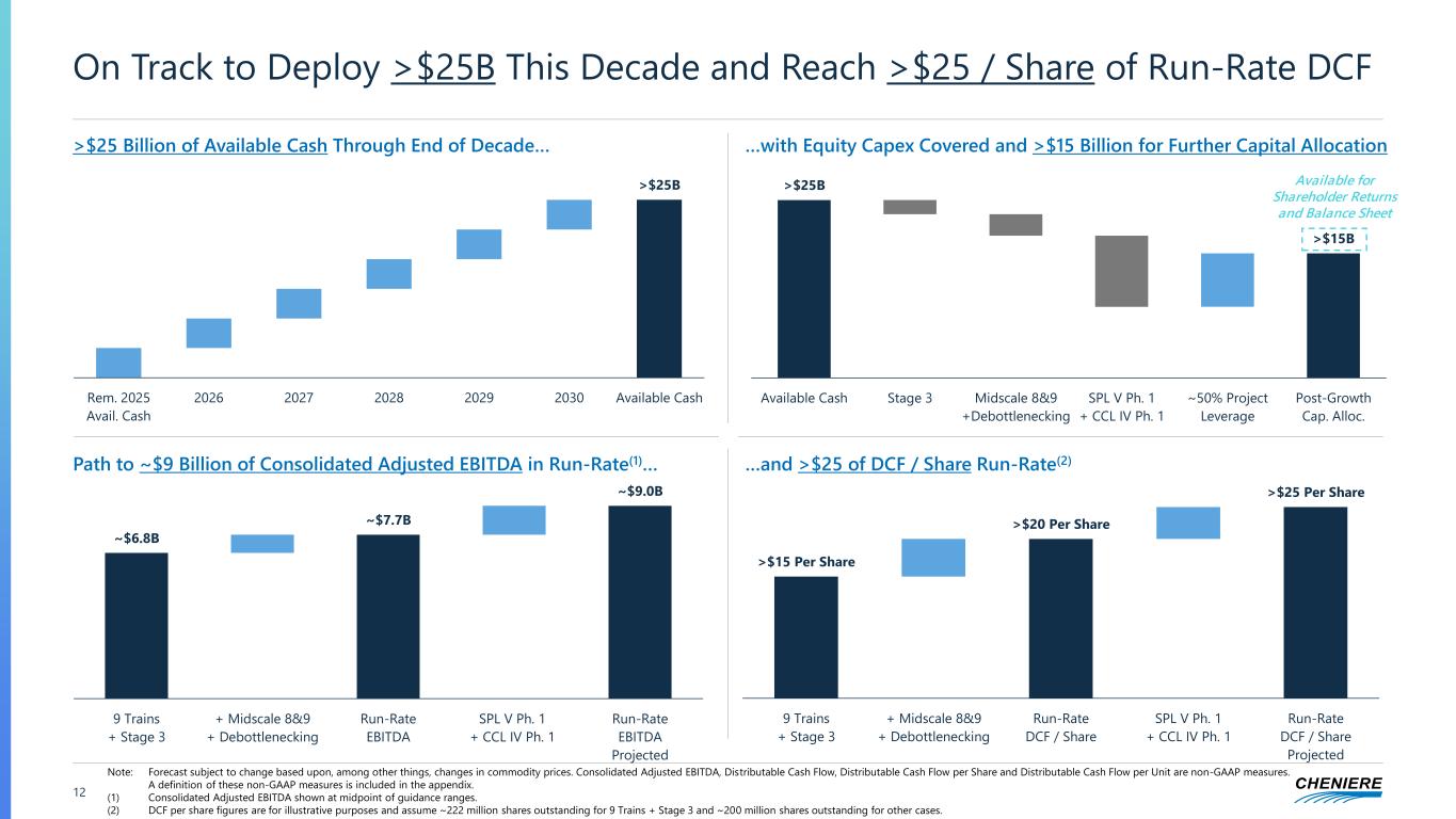 (1) CCL Stage 3 Project completion percentage as of April 30, 2025 and reflects: engineering 98.5% complete, procurement 99.8% complete, subcontract work 90.1% complete and construction 57.3% complete. (2) Inclusive of debottlenecking potential. 11 Pipeline of Accretive Liquefaction Growth ✓ FID’d and Under Construction ✓ Train 1 Substantial Completion Achieved March 2025 with 83.8% Project Completion(1) Near-Term Growth >60 MTPA Platform Longer-Term Growth Potential for Up to ~100 MTPA Platform CCL Stage 3 Trains 1-7 CCL Midscale Trains 8&9 SPL Stage V Expansion CCL Stage IV Expansion ~10+ MTPA Cheniere Total Current, Expected & Potential Future Liquefaction Capacity In Operation Today + Under Construction + Line-of-Sight Growth + Longer-Term Potential Growth ~60 - ~63 mtpa >46 mtpa Up To ~75 mtpa Up To ~100 mtpa Path to FID up to 75 MTPA this decade ✓ FID’d and Under Construction ✓ Cost-Advantaged Brownfield Project With No Need for Additional Berths, Tanks, or Pipelines ~5 MTPA (2) SPL T1-6 CCL T1-3 CCL Stage 3 CCL Midscale 8&9 Ph1 Expansions Longer-Term Potential Growth Up to ~20 MTPA Up to ~20 MTPA ✓ ✓ (2) (2) CCL Stage IV Development Site
