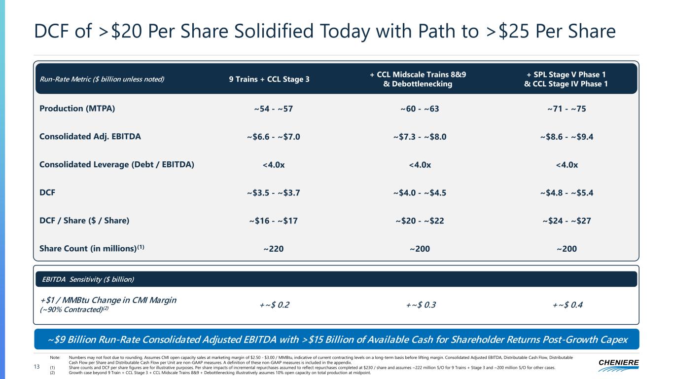 >$25B Rem. 2025 Avail. Cash 2026 2027 2028 2029 2030 Available Cash Note: Forecast subject to change based upon, among other things, changes in commodity prices. Consolidated Adjusted EBITDA, Distributable Cash Flow, Distributable Cash Flow per Share and Distributable Cash Flow per Unit are non-GAAP measures. A definition of these non-GAAP measures is included in the appendix. (1) Consolidated Adjusted EBITDA shown at midpoint of guidance ranges. (2) DCF per share figures are for illustrative purposes and assume ~222 million shares outstanding for 9 Trains + Stage 3 and ~200 million shares outstanding for other cases. 12 On Track to Deploy >$25B This Decade and Reach >$25 / Share of Run-Rate DCF …with Equity Capex Covered and >$15 Billion for Further Capital Allocation>$25 Billion of Available Cash Through End of Decade… …and >$25 of DCF / Share Run-Rate(2)Path to ~$9 Billion of Consolidated Adjusted EBITDA in Run-Rate(1)… ~$6.8B ~$7.7B ~$9.0B 9 Trains + Stage 3 + Midscale 8&9 + Debottlenecking Run-Rate EBITDA SPL V Ph. 1 + CCL IV Ph. 1 Run-Rate EBITDA Projected >$15 Per Share >$20 Per Share >$25 Per Share 9 Trains + Stage 3 + Midscale 8&9 + Debottlenecking Run-Rate DCF / Share SPL V Ph. 1 + CCL IV Ph. 1 Run-Rate DCF / Share Projected >$25B >$15B Available Cash Stage 3 Midscale 8&9 +Debottlenecking SPL V Ph. 1 + CCL IV Ph. 1 ~50% Project Leverage Post-Growth Cap. Alloc. Available for Shareholder Returns and Balance Sheet