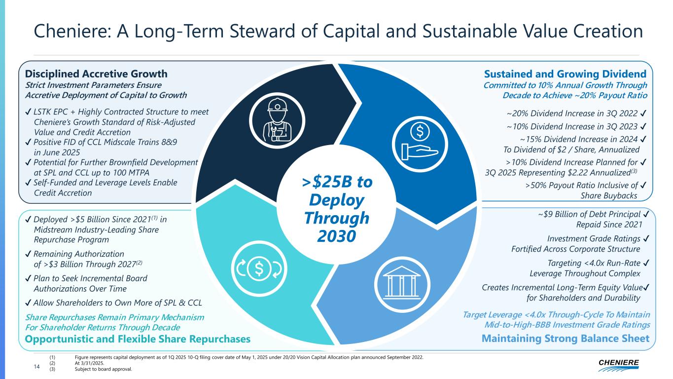 13 DCF of >$20 Per Share Solidified Today with Path to >$25 Per Share Note: Numbers may not foot due to rounding. Assumes CMI open capacity sales at marketing margin of $2.50 - $3.00 / MMBtu, indicative of current contracting levels on a long-term basis before lifting margin. Consolidated Adjusted EBITDA, Distributable Cash Flow, Distributable Cash Flow per Share and Distributable Cash Flow per Unit are non-GAAP measures. A definition of these non-GAAP measures is included in the appendix. (1) Share counts and DCF per share figures are for illustrative purposes. Per share impacts of incremental repurchases assumed to reflect repurchases completed at $230 / share and assumes ~222 million S/O for 9 Trains + Stage 3 and ~200 million S/O for other cases. (2) Growth case beyond 9 Train + CCL Stage 3 + CCL Midscale Trains 8&9 + Debottlenecking illustratively assumes 10% open capacity on total production at midpoint. Run-Rate Metric ($ billion unless noted) 9 Trains + CCL Stage 3 + CCL Midscale Trains 8&9 & Debottlenecking + SPL Stage V Phase 1 & CCL Stage IV Phase 1 Production (MTPA) ~54 - ~57 ~60 - ~63 ~71 - ~75 Consolidated Adj. EBITDA ~$6.6 - ~$7.0 ~$7.3 - ~$8.0 ~$8.6 - ~$9.4 Consolidated Leverage (Debt / EBITDA) <4.0x <4.0x <4.0x DCF ~$3.5 - ~$3.7 ~$4.0 - ~$4.5 ~$4.8 - ~$5.4 DCF / Share ($ / Share) ~$16 - ~$17 ~$20 - ~$22 ~$24 - ~$27 Share Count (in millions)(1) ~220 ~200 ~200 +$1 / MMBtu Change in CMI Margin (~90% Contracted)(2) +~$ 0.2 +~$ 0.3 +~$ 0.4 ~$9 Billion Run-Rate Consolidated Adjusted EBITDA with >$15 Billion of Available Cash for Shareholder Returns Post-Growth Capex EBITDA Sensitivity ($ billion)