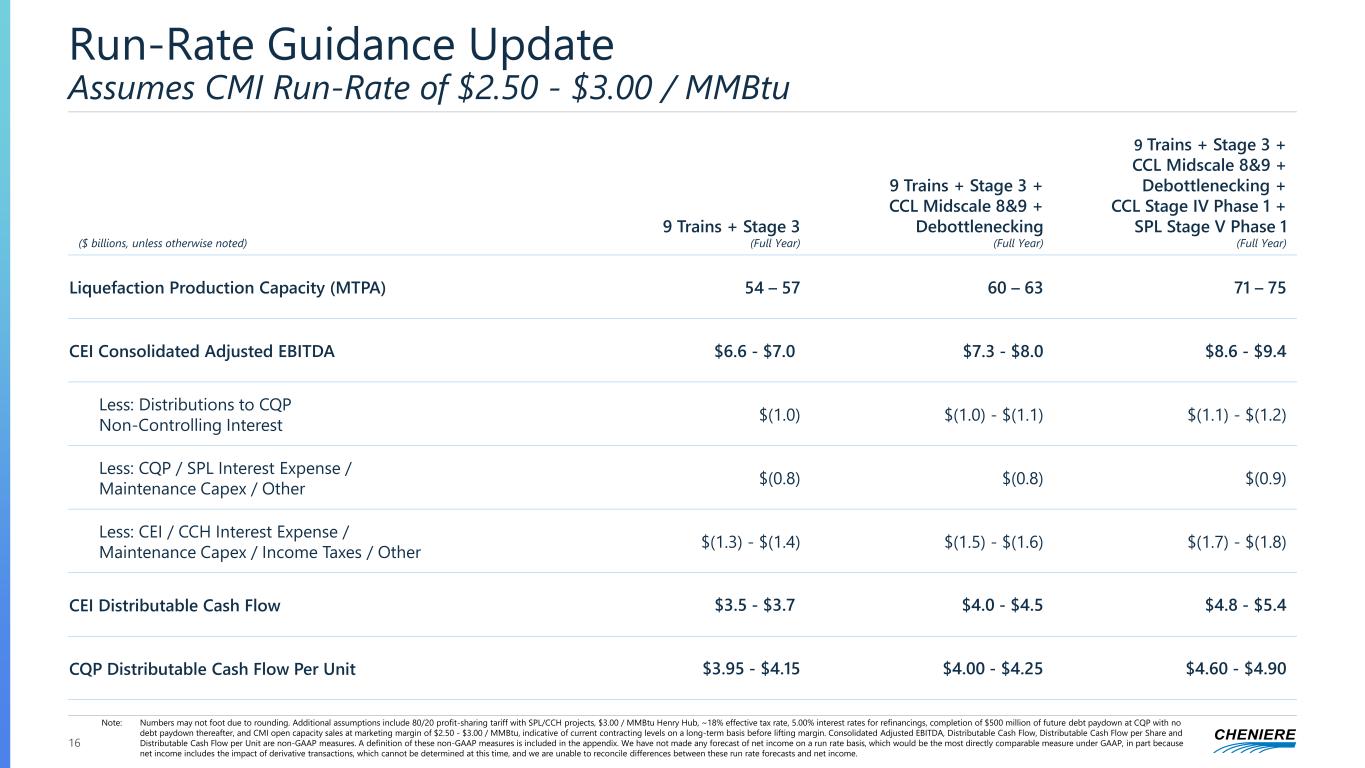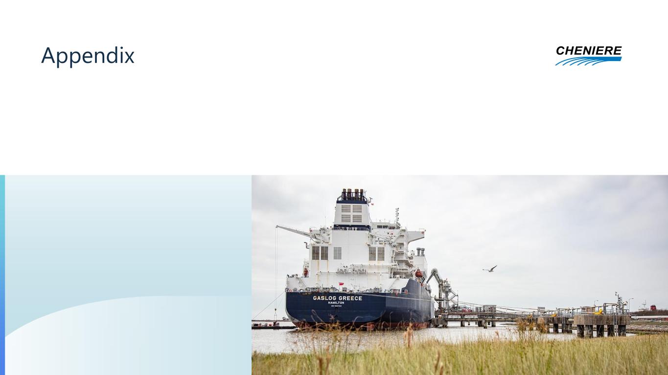 Regulation G Reconciliations This presentation contains non-GAAP financial measures. Consolidated Adjusted EBITDA, Distributable Cash Flow, Distributable Cash Flow per Share, and Distributable Cash Flow per Unit are non-GAAP financial measures that we use to facilitate comparisons of operating performance across periods. These non-GAAP measures should be viewed as a supplement to and not a substitute for our U.S. GAAP measures of performance and the financial results calculated in accordance with U.S. GAAP and reconciliations from these results should be carefully evaluated. Consolidated Adjusted EBITDA is commonly used as a supplemental financial measure by our management and external users of our consolidated financial statements to assess the financial performance of our assets without regard to financing methods, capital structures, or historical cost basis. Consolidated Adjusted EBITDA is not intended to represent cash flows from operations or net income as defined by U.S. GAAP and is not necessarily comparable to similarly titled measures reported by other companies. We believe Consolidated Adjusted EBITDA provides relevant and useful information to management, investors and other users of our financial information in evaluating the effectiveness of our operating performance in a manner that is consistent with management’s evaluation of financial and operating performance. Consolidated Adjusted EBITDA is calculated by taking net income attributable to Cheniere before net income attributable to non-controlling interests, interest expense, net of capitalized interest, taxes, depreciation, amortization and accretion expense, and adjusting for the effects of certain non-cash items, other non-operating income or expense items, and other items not otherwise predictive or indicative of ongoing operating performance, including the effects of modification or extinguishment of debt, impairment expense, gain or loss on disposal of assets, changes in the fair value of our commodity and FX derivatives prior to contractual delivery or termination, and non-cash compensation expense. The change in fair value of commodity and FX derivatives is considered in determining Consolidated Adjusted EBITDA given that the timing of recognizing gains and losses on these derivative contracts differs from the recognition of the related item economically hedged. We believe the exclusion of these items enables investors and other users of our financial information to assess our sequential and year-over-year performance and operating trends on a more comparable basis and is consistent with management’s own evaluation of performance. Distributable Cash Flow is defined as cash generated from the operations of Cheniere and its subsidiaries and adjusted for non-controlling interests. The Distributable Cash Flow of Cheniere’s subsidiaries is calculated by taking the subsidiaries’ EBITDA less interest expense, net of capitalized interest, taxes, maintenance capital expenditures and other non-operating income or expense items, and adjusting for the effect of certain non-cash items and other items not otherwise predictive or indicative of ongoing operating performance, including the effects of modification or extinguishment of debt, amortization of debt issue costs, premiums or discounts, impairment of equity method investment and deferred taxes. Cheniere’s Distributable Cash Flow includes 100% of the Distributable Cash Flow of Cheniere’s wholly-owned subsidiaries. For subsidiaries with non-controlling investors, our share of Distributable Cash Flow is calculated as the Distributable Cash Flow of the subsidiary reduced by the economic interest of the non-controlling investors as if 100% of the Distributable Cash Flow were distributed in order to reflect our ownership interests and our incentive distribution rights, if applicable. The Distributable Cash Flow attributable to non-controlling interests is calculated in the same method as Distributions to non-controlling interests as presented on Statements of Stockholders’ Equity. This amount may differ from the actual distributions paid to non-controlling investors by the subsidiary for a particular period. CQP Distributable Cash Flow is defined as CQP Adjusted EBITDA adjusted for taxes, maintenance capital expenditures, interest expense net of capitalized interest, and interest income. Distributable Cash Flow per Share and Distributable Cash Flow per Unit are calculated by dividing Distributable Cash Flow by the weighted average number of common shares or units outstanding. We believe Distributable Cash Flow is a useful performance measure for management, investors and other users of our financial information to evaluate our performance and to measure and estimate the ability of our assets to generate cash earnings after servicing our debt, paying cash taxes and expending sustaining capital, that could be considered for deployment by our Board of Directors pursuant to our capital allocation plan, such as by way of common stock dividends, stock repurchases, retirement of debt, or expansion capital expenditures.1 Distributable Cash Flow is not intended to represent cash flows from operations or net income as defined by U.S. GAAP and is not necessarily comparable to similarly titled measures reported by other companies. Non-GAAP measures have limitations as an analytical tool and should not be considered in isolation or in lieu of an analysis of our results as reported under GAAP and should be evaluated only on a supplementary basis. Note: We have not made any forecast of net income on a run rate basis, which would be the most directly comparable financial measure under GAAP, in part because net income includes the impact of derivative transactions, which cannot be determined at this time, and we are unable to reconcile differences between run rate Consolidated Adjusted EBITDA and Distributable Cash Flow and income. 1 Capital spending for our business consists pr