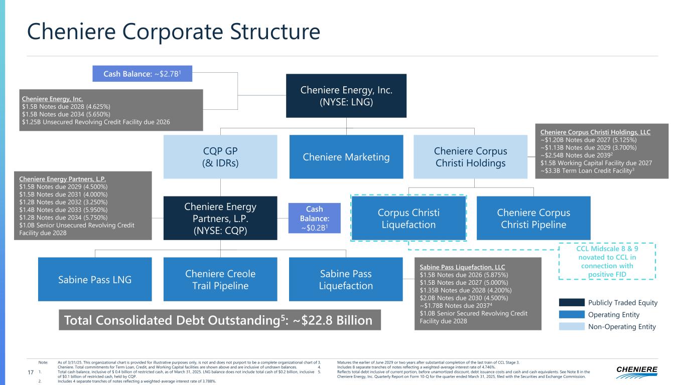 ($ billions, unless otherwise noted) 9 Trains + Stage 3 (Full Year) 9 Trains + Stage 3 + CCL Midscale 8&9 + Debottlenecking (Full Year) 9 Trains + Stage 3 + CCL Midscale 8&9 + Debottlenecking + CCL Stage IV Phase 1 + SPL Stage V Phase 1 (Full Year) Liquefaction Production Capacity (MTPA) 54 – 57 60 – 63 71 – 75 CEI Consolidated Adjusted EBITDA $6.6 - $7.0) $7.3 - $8.0 $8.6 - $9.4 Less: Distributions to CQP Non-Controlling Interest $(1.0) $(1.0) - $(1.1) $(1.1) - $(1.2) Less: CQP / SPL Interest Expense / Maintenance Capex / Other $(0.8) $(0.8) $(0.9) Less: CEI / CCH Interest Expense / Maintenance Capex / Income Taxes / Other $(1.3) - $(1.4) $(1.5) - $(1.6) $(1.7) - $(1.8) CEI Distributable Cash Flow $3.5 - $3.7) $4.0 - $4.5 $4.8 - $5.4 CQP Distributable Cash Flow Per Unit $3.95 - $4.15 $4.00 - $4.25 $4.60 - $4.90 16 Run-Rate Guidance Update Assumes CMI Run-Rate of $2.50 - $3.00 / MMBtu Note: Numbers may not foot due to rounding. Additional assumptions include 80/20 profit-sharing tariff with SPL/CCH projects, $3.00 / MMBtu Henry Hub, ~18% effective tax rate, 5.00% interest rates for refinancings, completion of $500 million of future debt paydown at CQP with no debt paydown thereafter, and CMI open capacity sales at marketing margin of $2.50 - $3.00 / MMBtu, indicative of current contracting levels on a long-term basis before lifting margin. Consolidated Adjusted EBITDA, Distributable Cash Flow, Distributable Cash Flow per Share and Distributable Cash Flow per Unit are non-GAAP measures. A definition of these non-GAAP measures is included in the appendix. We have not made any forecast of net income on a run rate basis, which would be the most directly comparable measure under GAAP, in part because net income includes the impact of derivative transactions, which cannot be determined at this time, and we are unable to reconcile differences between these run rate forecasts and net income.